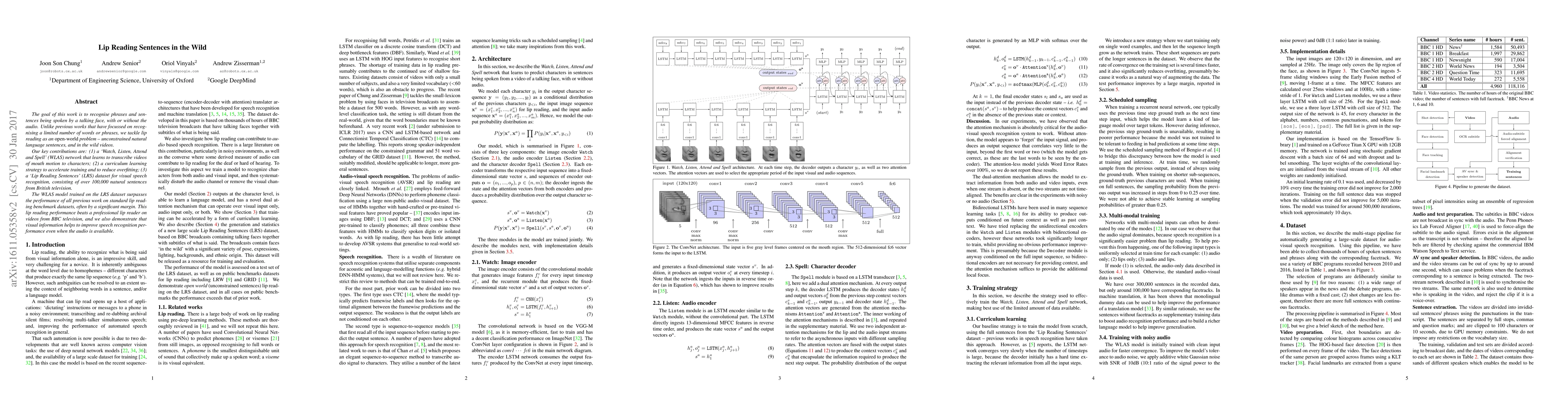 This paper introduces the 'Watch, Listen, Attend and Spell' (WLAS) network for recognizing sentences from talking faces, even without audio. Trained on the 'Lip Reading Sentences' (LRS) dataset of over 100,000 natural sentences, the WLAS model outperforms previous lip-reading methods and even surpasses human professionals in some cases, demonstrating improved speech recognition with visual cues.