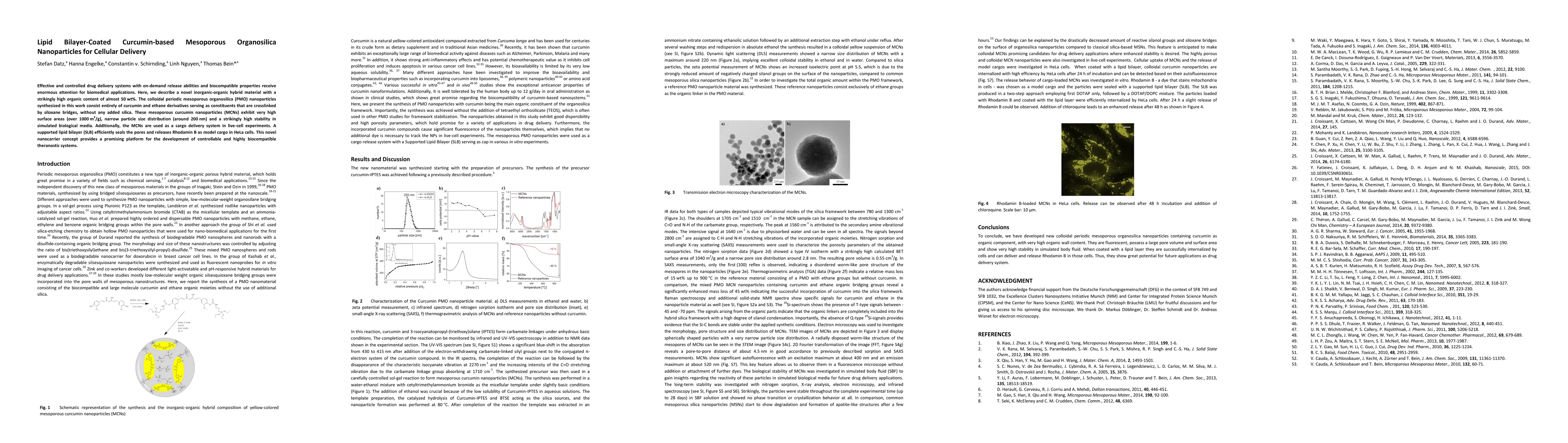 This paper introduces lipid bilayer-coated mesoporous organosilica nanoparticles composed entirely of curcumin and ethane derivatives, offering high surface area, stability, and biocompatibility. The nanoparticles are shown to effectively deliver cargo in live-cell experiments, suggesting potential for advanced theranostic applications.