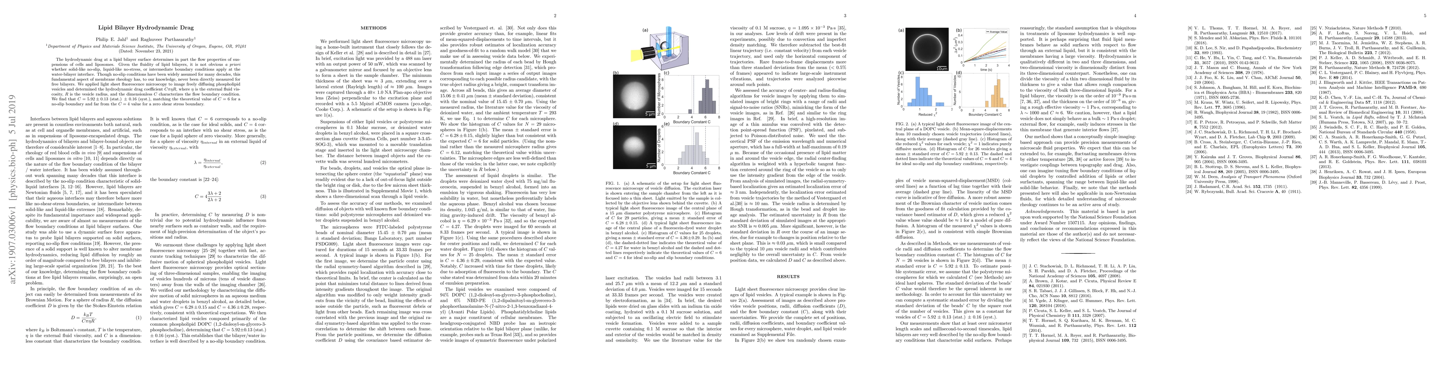 This study uses light sheet fluorescence microscopy to measure the hydrodynamic drag coefficient at the surface of lipid bilayers, determining that the boundary condition is a no-slip condition, as indicated by a drag coefficient of $C = 5.92 \pm 0.13$ (stat.) $\pm 0.16$ (syst.), close to the theoretical no-slip value of $C=6$.