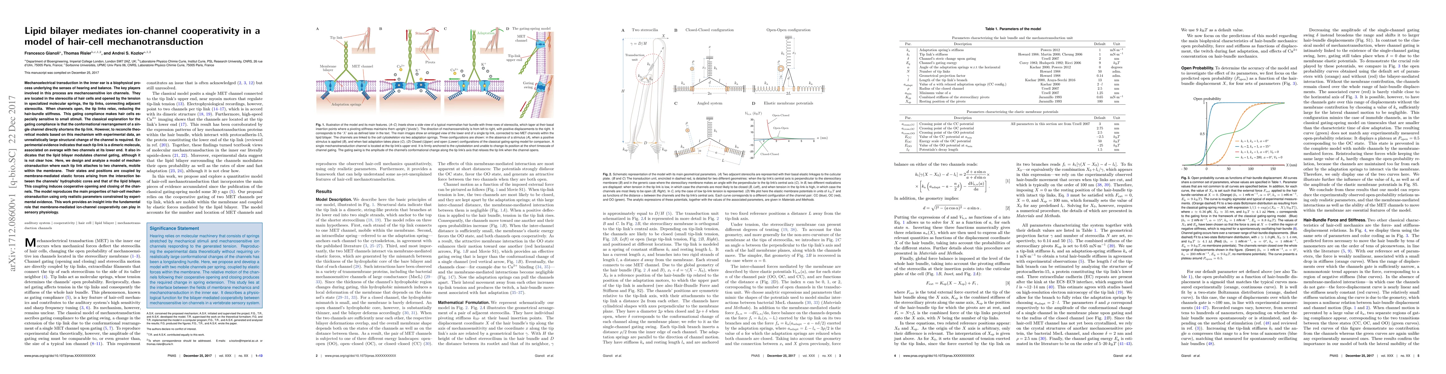 This paper proposes a model where lipid bilayer-mediated elastic forces induce cooperative gating of mechanosensitive ion channels in hair cells, explaining gating compliance without requiring large structural changes. The model aligns with experimental data and highlights the role of membrane-mediated cooperativity in mechanotransduction.