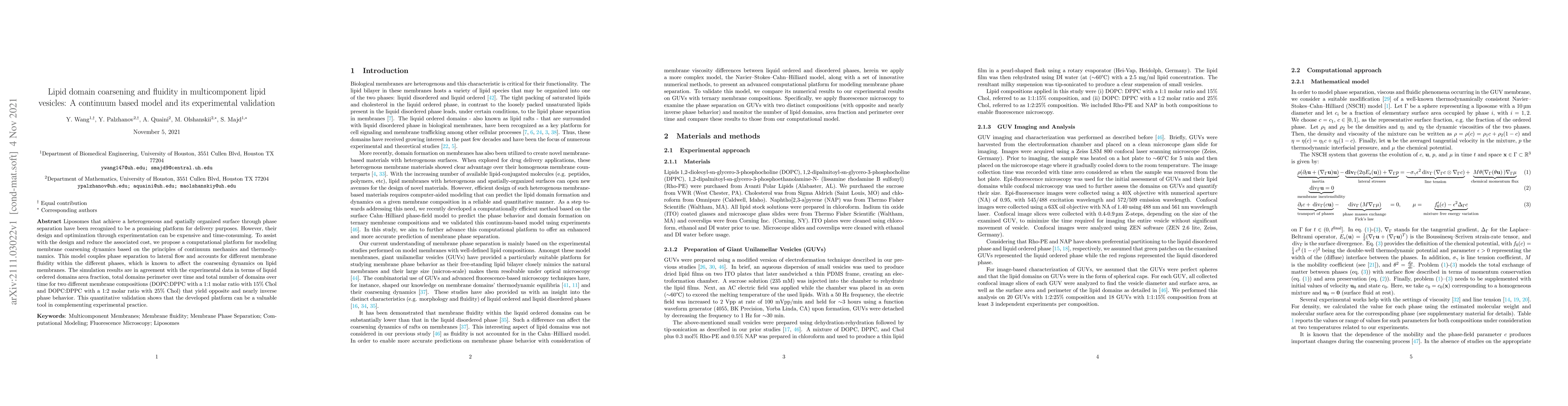 This paper proposes a computational model based on continuum mechanics to simulate lipid domain coarsening and fluidity in multicomponent lipid vesicles, validated experimentally to predict phase separation dynamics and membrane fluidity effects. The model's accuracy is demonstrated by its agreement with experimental data on domain formation in different lipid compositions.