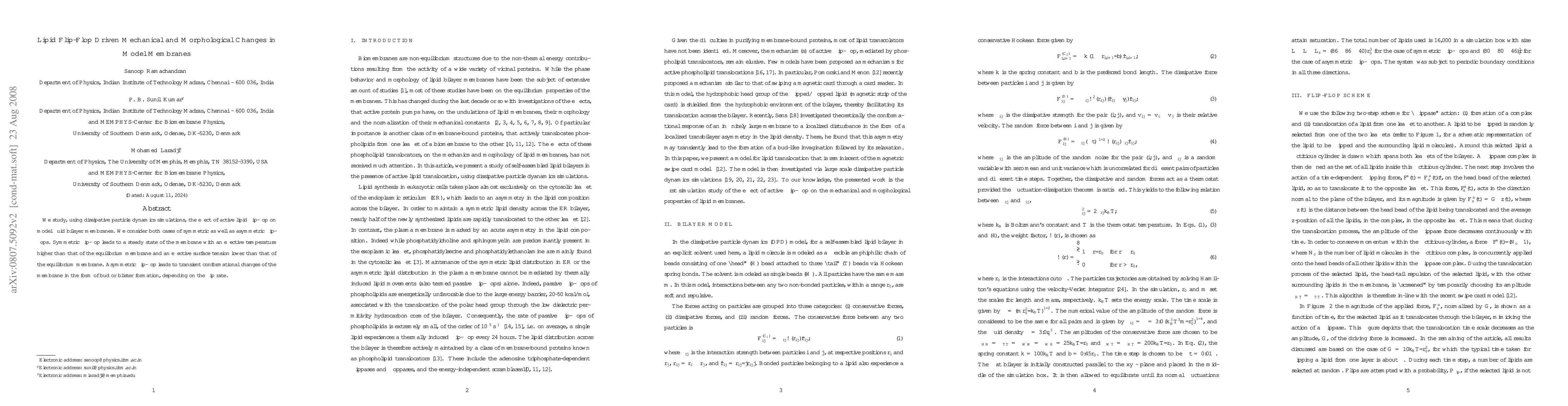 Two-line summary: This study employs dissipative particle dynamics simulations to investigate how active lipid flip-flop affects model fluid bilayer membranes, distinguishing between symmetric and asymmetric flip-flops. Symmetric flip-flop results in a steady state with elevated effective temperature and reduced surface tension, while asymmetric flip-flop induces transient morphological changes like bud or blister formation.