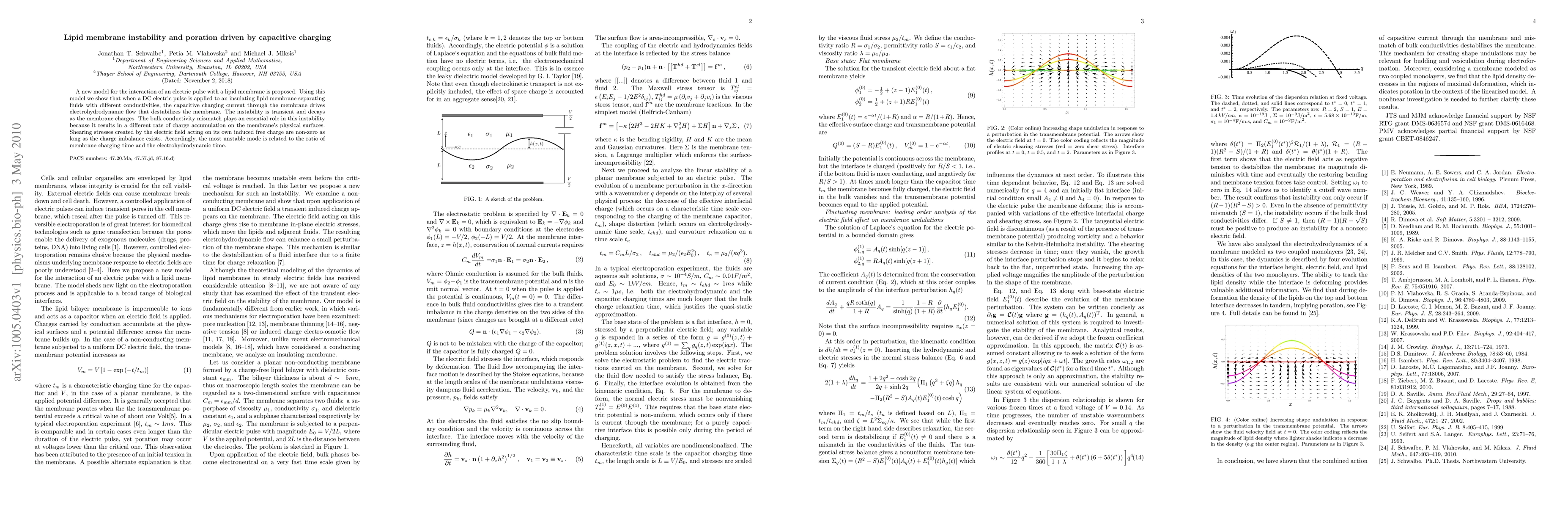 This paper proposes a model explaining how a DC electric pulse applied to a lipid membrane causes transient instability through capacitive charging, driven by the electrohydrodynamic flow resulting from the bulk conductivity mismatch between fluids on either side of the membrane. The instability decays as the membrane charges, with the most unstable mode linked to the ratio of membrane charging and electrohydrodynamic times.