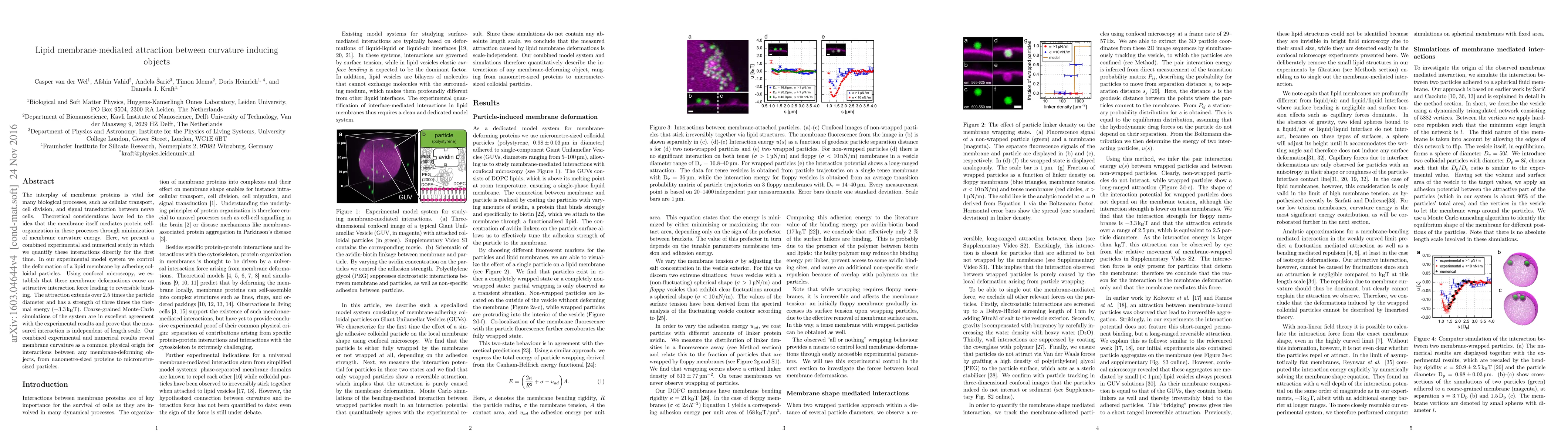 This study experimentally and numerically demonstrates that lipid membranes mediate attractive forces between curvature-inducing objects, such as colloidal particles, through curvature energy minimization. The observed interactions are reversible, extend over 2.5 times the particle diameter, and are consistent across length scales.