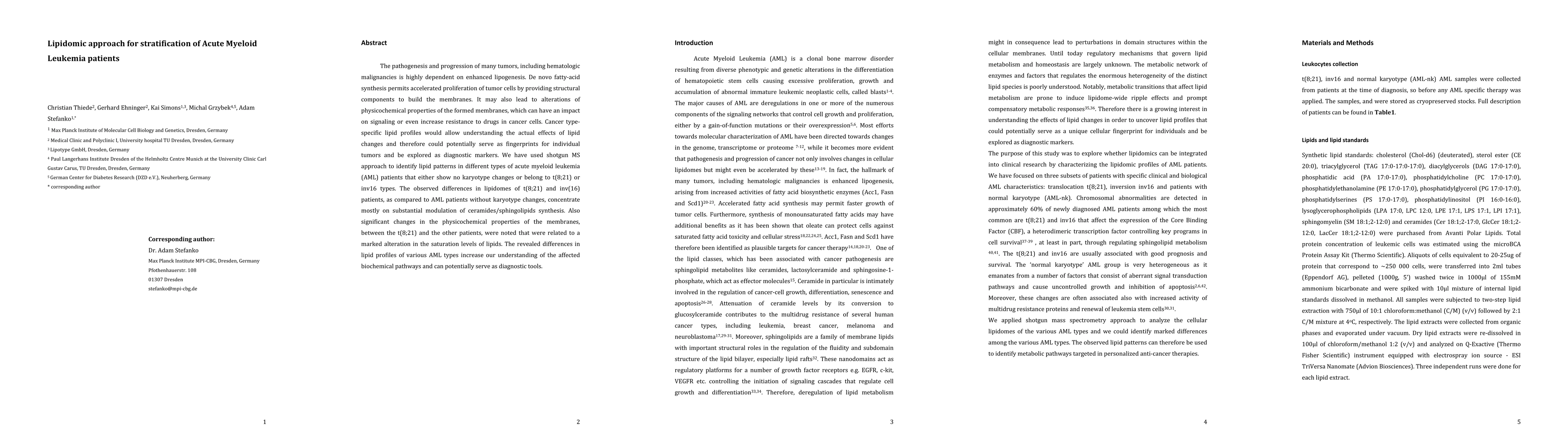 This study uses a lipidomic approach to identify distinct lipid profiles in different types of acute myeloid leukemia (AML) patients, revealing significant differences in ceramides/sphingolipids synthesis and membrane lipid saturation, which could serve as diagnostic markers for AML stratification.