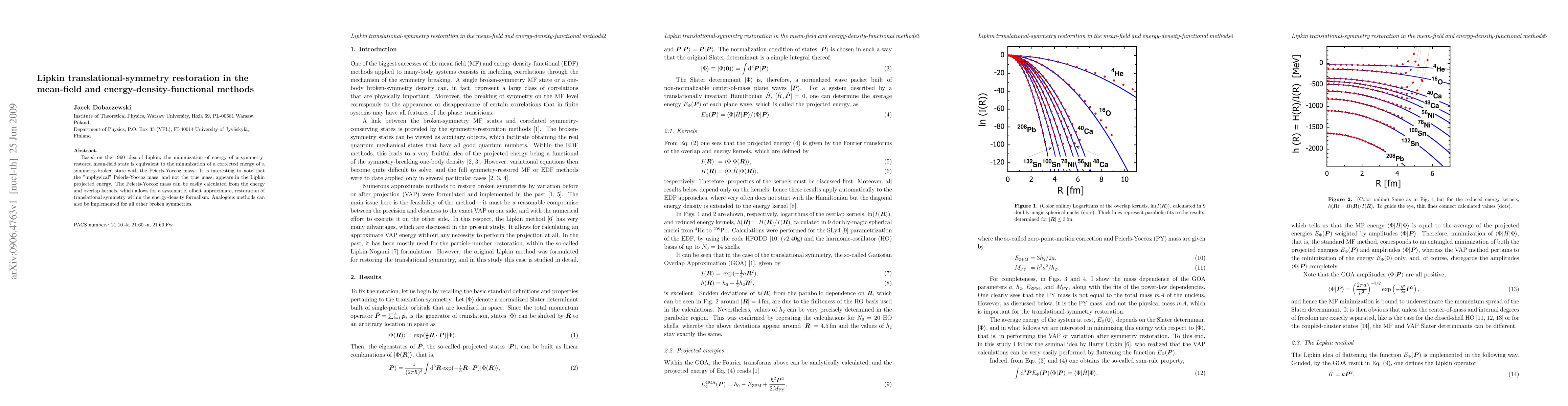 This paper explores the Lipkin translational-symmetry restoration method, demonstrating that minimizing the energy of a symmetry-restored mean-field state is equivalent to minimizing the corrected energy of a symmetry-broken state using the Peierls-Yoccoz mass. The Peierls-Yoccoz mass, though unphysical, facilitates the systematic restoration of translational symmetry within the energy-density formalism.