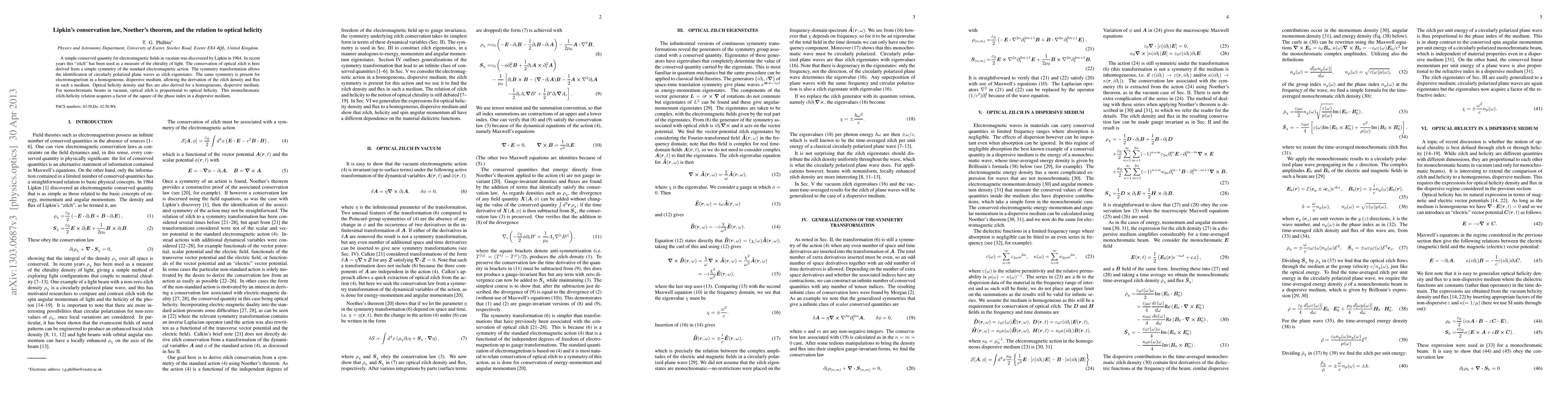 A simple conserved quantity for electromagnetic fields in vacuum was discovered by Lipkin in 1964. In recent years this "zilch" has been used as a measure of the chirality of light. The conservation of optical zilch is here derived from a simple symmetry of the standard electromagnetic action. The symmetry transformation allows the identification of circularly polarized plane waves as zilch eigenstates. The same symmetry is present for electromagnetism in a homogeneous, dispersive medium, allowing the derivation of the zilch density and flux in such a medium. Optical helicity density and flux are also derived for a homogeneous, dispersive medium. For monochromatic beams in vacuum, optical zilch is proportional to optical helicity. This monochromatic zilch-helicity relation acquires a factor of the square of the phase index in a dispersive medium.