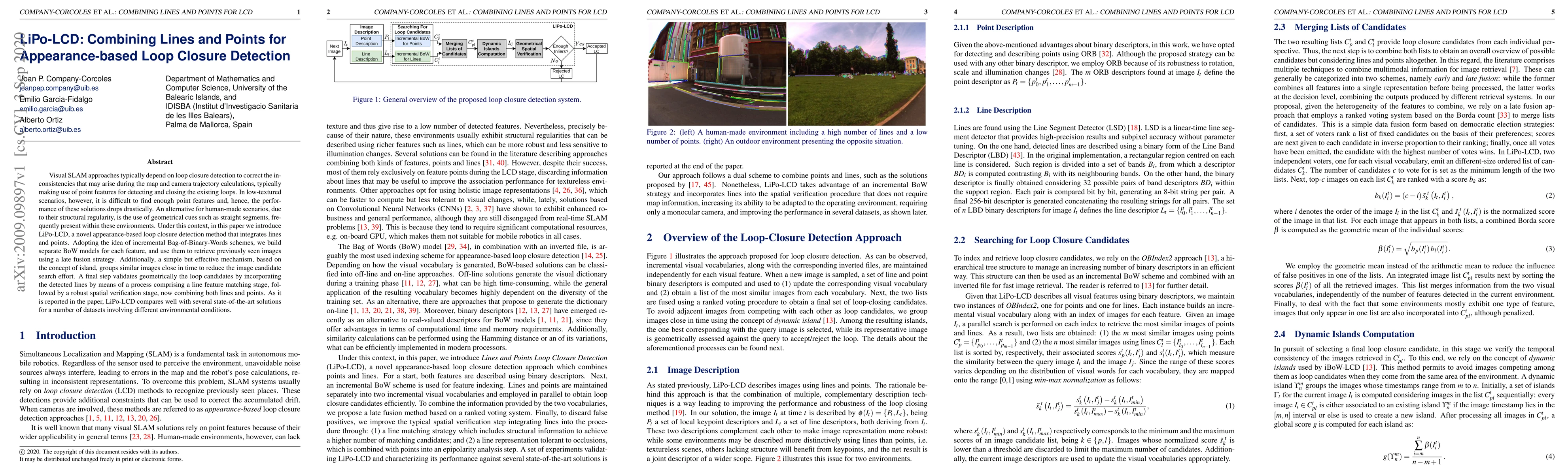 LiPo-LCD integrates lines and points for loop closure detection in visual SLAM, addressing the challenge of insufficient point features in low-textured environments. It combines Bag-of-Binary-Words schemes with a late fusion strategy and island-based grouping for efficient image retrieval, followed by geometric validation of loop candidates.