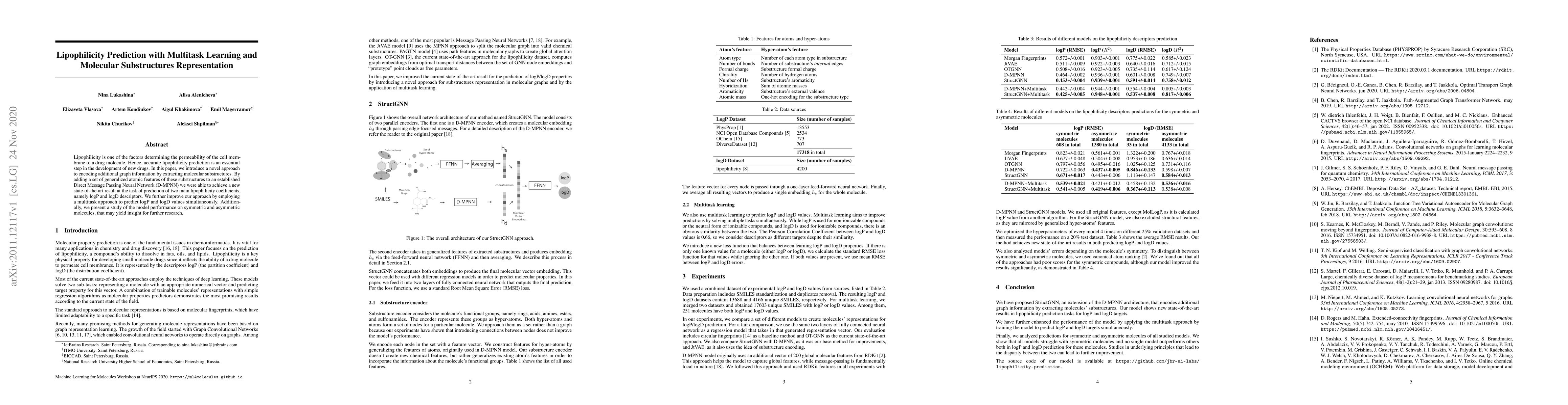 Lipophilicity is one of the factors determining the permeability of the cell membrane to a drug molecule. Hence, accurate lipophilicity prediction is an essential step in the development of new drugs. In this paper, we introduce a novel approach to encoding additional graph information by extracting molecular substructures. By adding a set of generalized atomic features of these substructures to an established Direct Message Passing Neural Network (D-MPNN) we were able to achieve a new state-of-the-art result at the task of prediction of two main lipophilicity coefficients, namely logP and logD descriptors. We further improve our approach by employing a multitask approach to predict logP and logD values simultaneously. Additionally, we present a study of the model performance on symmetric and asymmetric molecules, that may yield insight for further research.