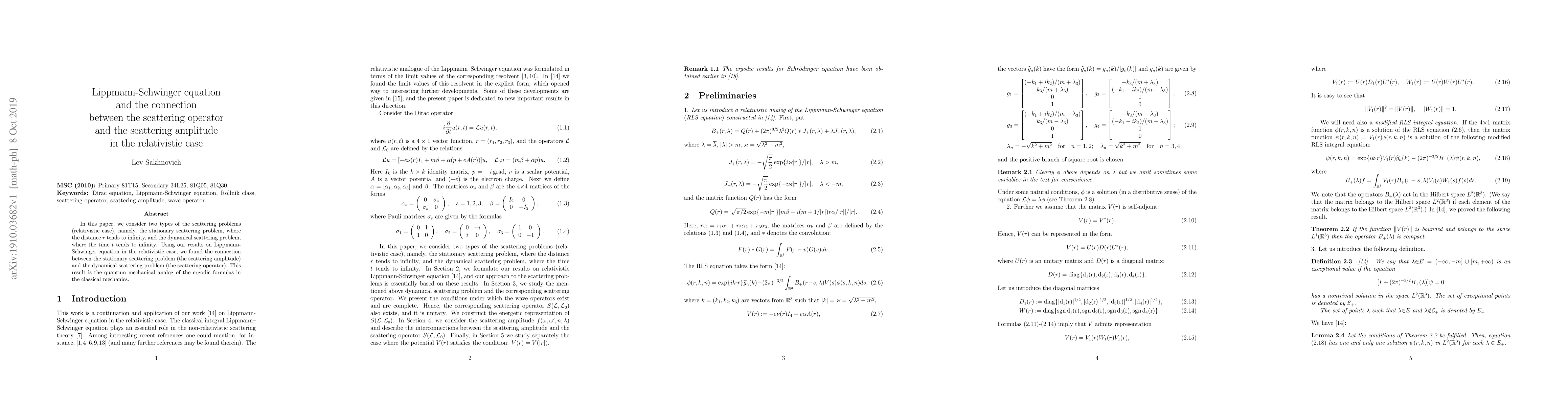 This paper explores the connection between the stationary scattering problem and the dynamical scattering problem in relativistic quantum mechanics using the Lippmann-Schwinger equation. It establishes a link between the scattering amplitude and the scattering operator, analogous to the ergodic formulas in classical mechanics.