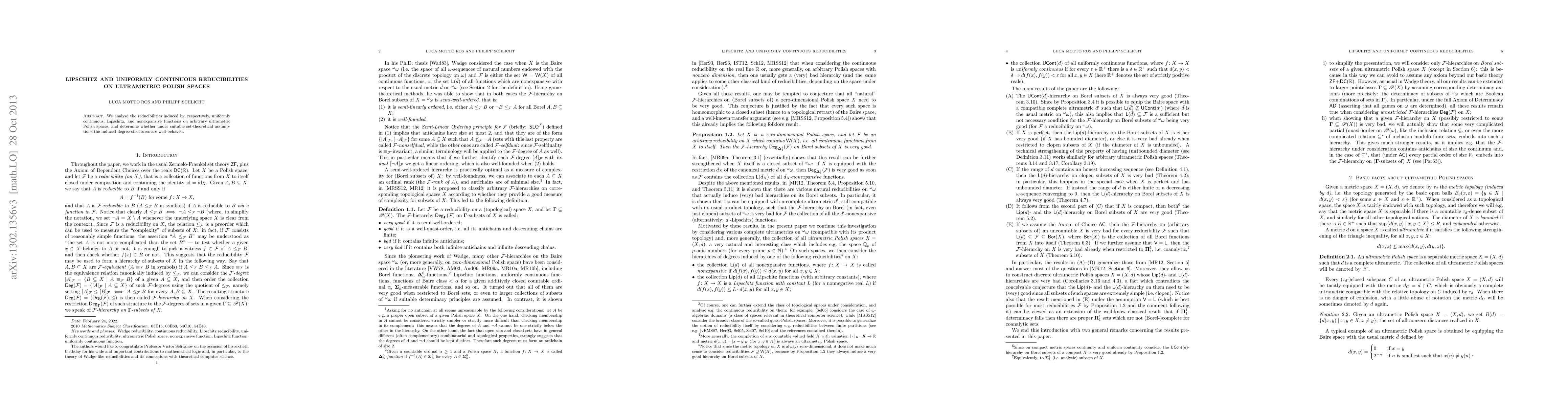 This paper investigates the reducibilities induced by uniformly continuous, Lipschitz, and nonexpansive functions on ultrametric Polish spaces, aiming to determine the degree-structures' behavior under specific set-theoretical assumptions.