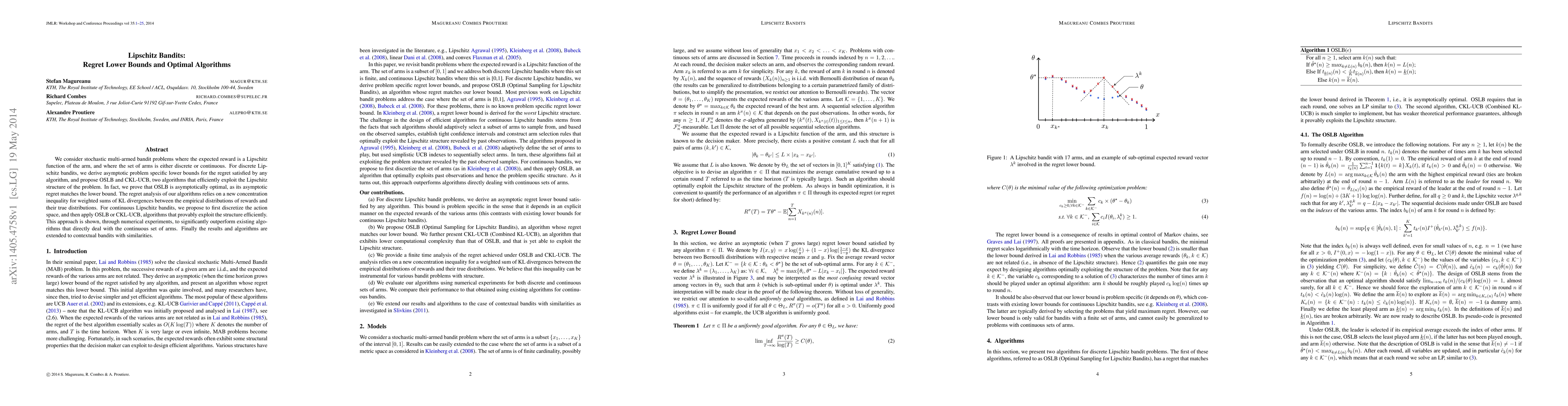 This paper investigates stochastic multi-armed bandit problems where rewards are Lipschitz functions of the chosen arm. It establishes lower bounds for regret and proposes optimal algorithms, OSLB and CKL-UCB, that leverage the Lipschitz property, proving OSLB's asymptotic optimality. For continuous bandits, it suggests discretizing the action space and applying the proposed algorithms, which outperform existing continuous methods.