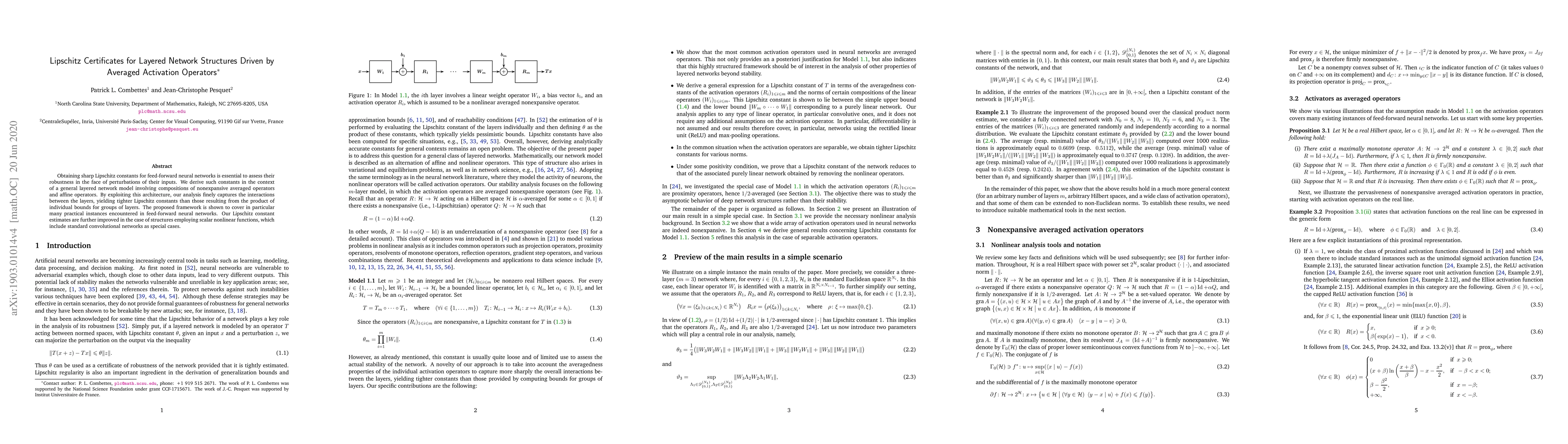 Obtaining sharp Lipschitz constants for feed-forward neural networks is essential to assess their robustness in the face of perturbations of their inputs. We derive such constants in the context of a general layered network model involving compositions of nonexpansive averaged operators and affine operators. By exploiting this architecture, our analysis finely captures the interactions between the layers, yielding tighter Lipschitz constants than those resulting from the product of individual bounds for groups of layers. The proposed framework is shown to cover in particular many practical instances encountered in feed-forward neural networks. Our Lipschitz constant estimates are further improved in the case of structures employing scalar nonlinear functions, which include standard convolutional networks as special cases.