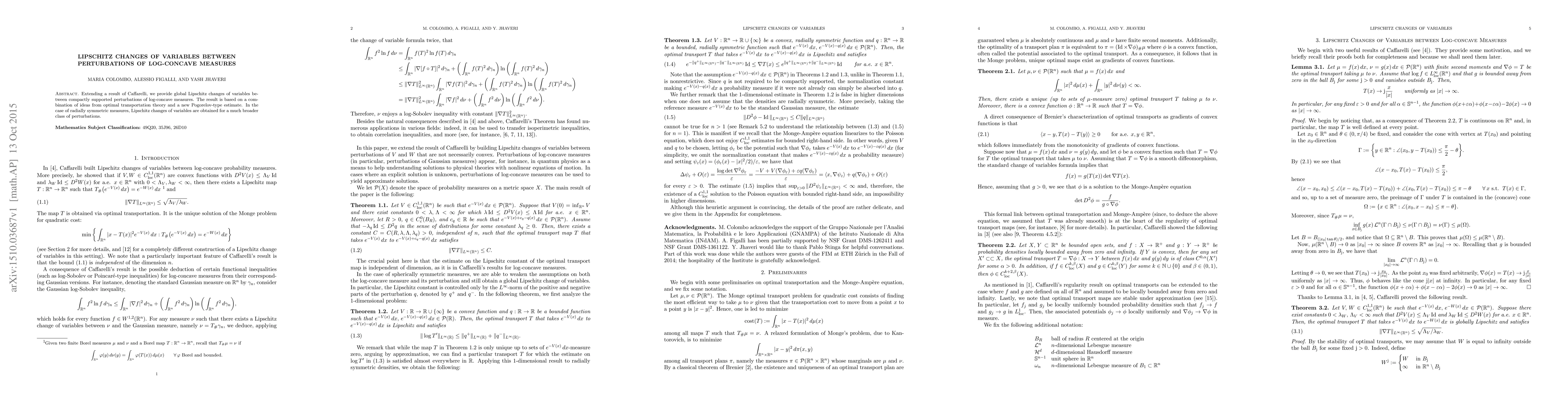 Extending a result of Caffarelli, we provide global Lipschitz changes of variables between compactly supported perturbations of log-concave measures. The result is based on a combination of ideas from optimal transportation theory and a new Pogorelov-type estimate. In the case of radially symmetric measures, Lipschitz changes of variables are obtained for a much broader class of perturbations.