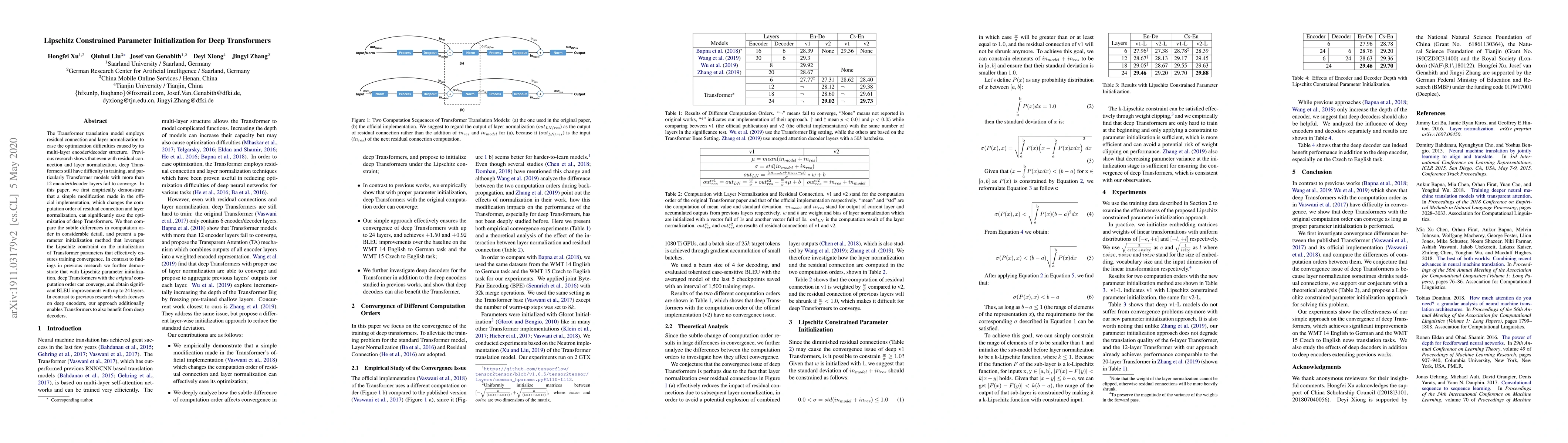 The Transformer translation model employs residual connection and layer normalization to ease the optimization difficulties caused by its multi-layer encoder/decoder structure. Previous research shows that even with residual connection and layer normalization, deep Transformers still have difficulty in training, and particularly Transformer models with more than 12 encoder/decoder layers fail to converge. In this paper, we first empirically demonstrate that a simple modification made in the official implementation, which changes the computation order of residual connection and layer normalization, can significantly ease the optimization of deep Transformers. We then compare the subtle differences in computation order in considerable detail, and present a parameter initialization method that leverages the Lipschitz constraint on the initialization of Transformer parameters that effectively ensures training convergence. In contrast to findings in previous research we further demonstrate that with Lipschitz parameter initialization, deep Transformers with the original computation order can converge, and obtain significant BLEU improvements with up to 24 layers. In contrast to previous research which focuses on deep encoders, our approach additionally enables Transformers to also benefit from deep decoders.