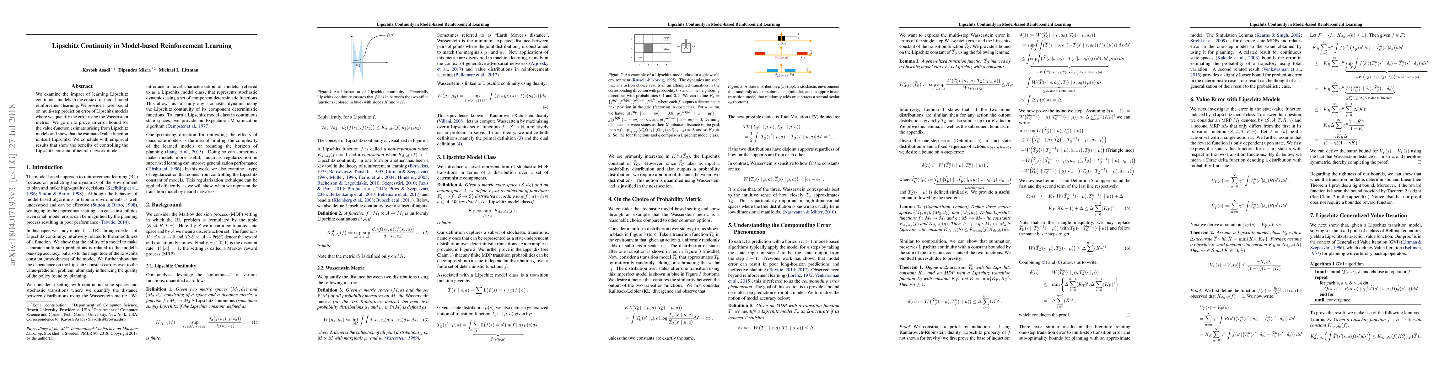 We examine the impact of learning Lipschitz continuous models in the context of model-based reinforcement learning. We provide a novel bound on multi-step prediction error of Lipschitz models where we quantify the error using the Wasserstein metric. We go on to prove an error bound for the value-function estimate arising from Lipschitz models and show that the estimated value function is itself Lipschitz. We conclude with empirical results that show the benefits of controlling the Lipschitz constant of neural-network models.