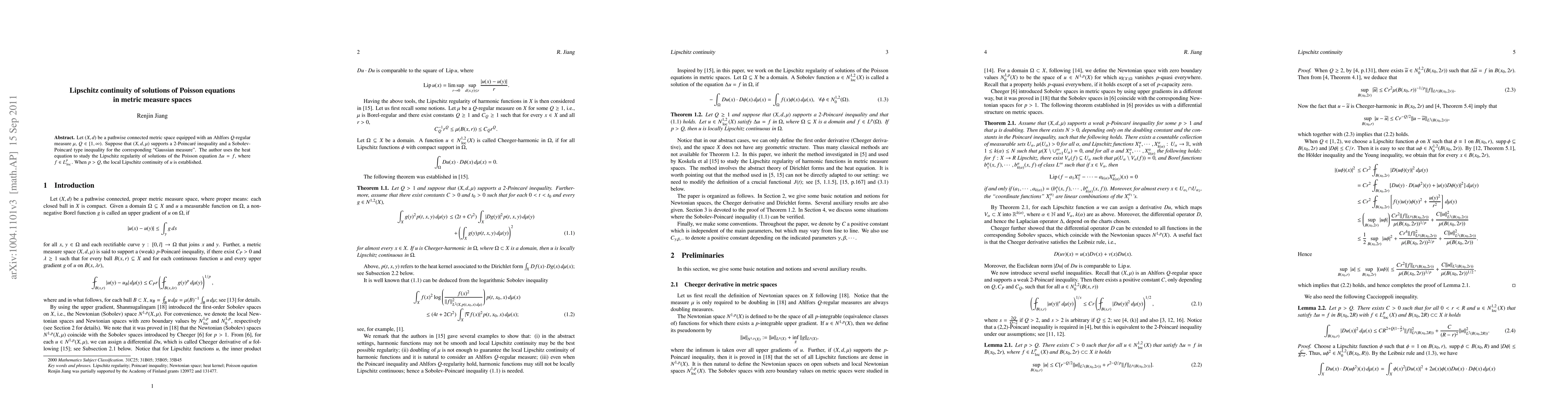 Let $(X,d)$ be a pathwise connected metric space equipped with an Ahlfors $Q$-regular measure $\mu$, $Q\in[1,\infty)$. Suppose that $(X,d,\mu)$ supports a 2-Poincar\'e inequality and a Sobolev-Poincar\'e type inequality for the corresponding "Gaussian measure". The author uses the heat equation to study the Lipschitz regularity of solutions of the Poisson equation $\Delta u=f$, where $f\in L^p_\loc$. When $p>Q$, the local Lipschitz continuity of $u$ is established.