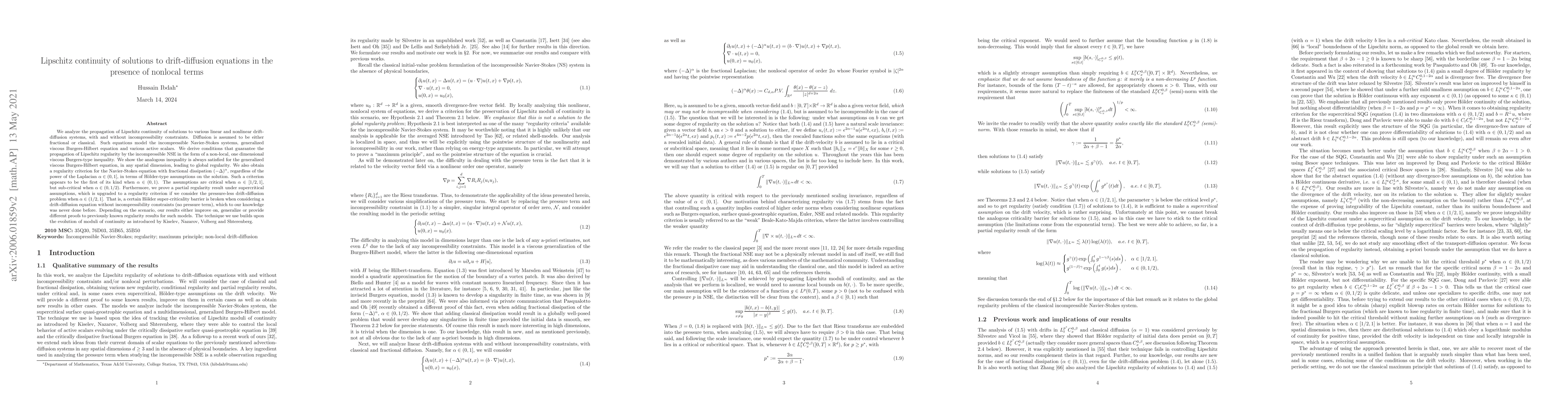 We analyze the propagation of Lipschitz continuity of solutions to various linear and nonlinear drift-diffusion systems, with and without incompressibility constraints. Diffusion is assumed to be either fractional or classical. Such equations model the incompressible Navier-Stokes systems, generalized viscous Burgers-Hilbert equation and various active scalars. We derive conditions that guarantee the propagation of Lipschitz regularity by the incompressible NSE in the form of a non-local, one dimensional viscous Burgers-type inequality. We show the analogous inequality is always satisfied for the generalized viscous Burgers-Hilbert equation, in any spatial dimension, leading to global regularity. We also obtain a regularity criterion for the Navier-Stokes equation with fractional dissipation $(-\Delta)^{\alpha}$, regardless of the power of the Laplacian $\alpha\in(0,1]$, in terms of H\"older-type assumptions on the solution. Such a criterion appears to be the first of its kind when $\alpha\in(0,1)$. The assumptions are critical when $\alpha\in[1/2,1]$, but sub-critical when $\alpha\in(0,1/2)$. Furthermore, we prove a partial regularity result under supercritical assumptions, which is upgraded to a regularity criterion if we consider the pressure-less drift-diffusion problem when $\alpha\in(1/2,1]$. That is, a certain H\"older super-criticality barrier is broken when considering a drift-diffusion equation without incompressibility constraints (no pressure term), which to our knowledge was never done before. Depending on the scenario, our results either improve on, generalize or provide different proofs to previously known regularity results for such models. The technique we use builds upon the evolution of moduli of continuity as introduced by Kiselev, Nazarov, Volberg and Shterenberg.