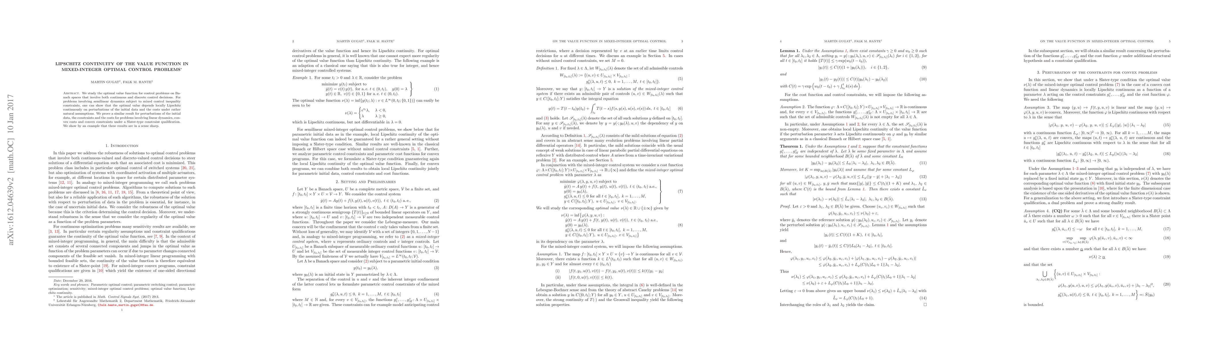 We study the optimal value function for control problems on Banach spaces that involve both continuous and discrete control decisions. For problems involving semilinear dynamics subject to mixed control inequality constraints, one can show that the optimal value depends locally Lipschitz continuously on perturbations of the initial data and the costs under rather natural assumptions. We prove a similar result for perturbations of the initial data, the constraints and the costs for problems involving linear dynamics, convex costs and convex constraints under a Slater-type constraint qualification. We show by an example that these results are in a sense sharp.