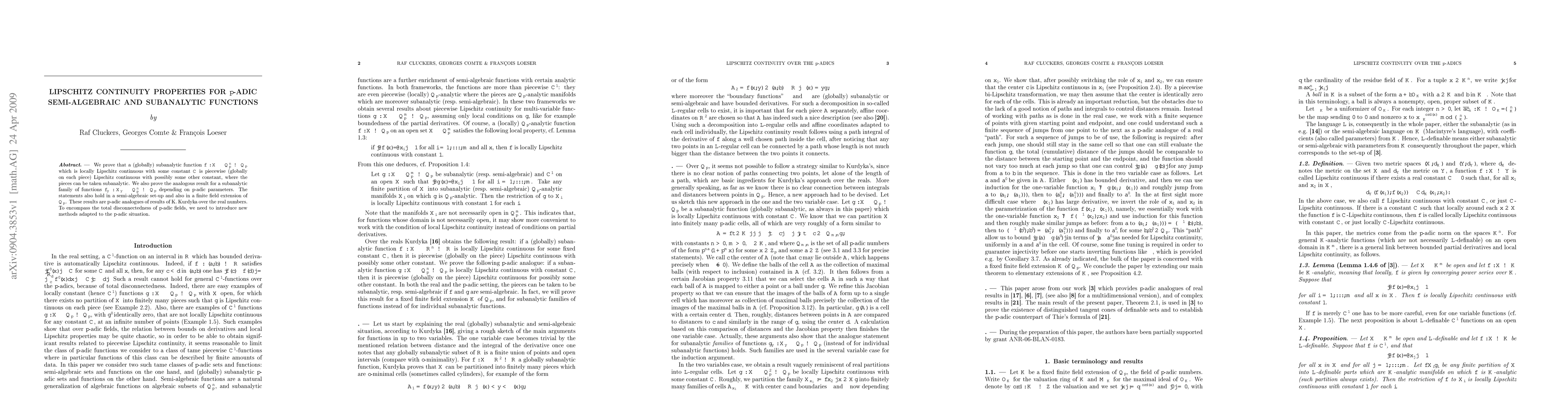 This paper proves that locally Lipschitz continuous subanalytic p-adic functions are globally piecewise Lipschitz with potentially different constants, where the pieces are subanalytic. It also extends these results to families of such functions and semi-algebraic settings, introducing new methods tailored to p-adic fields.
