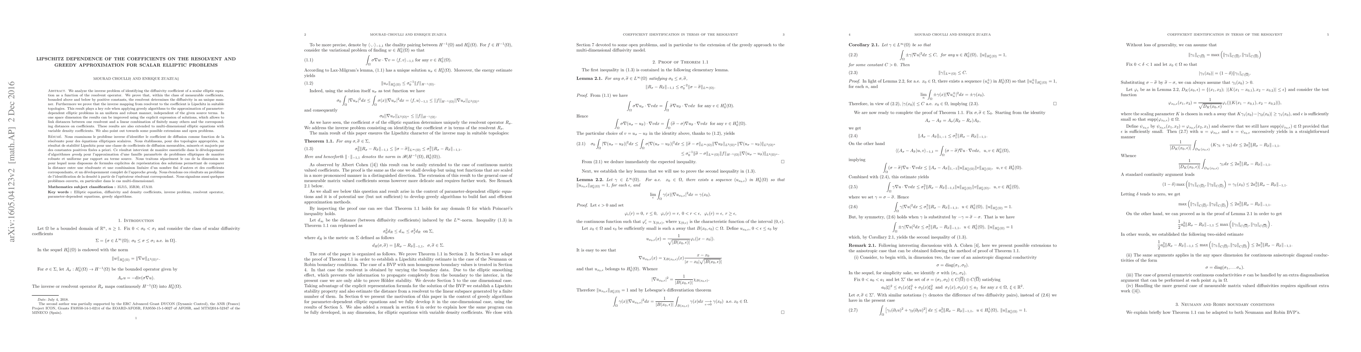 We analyze the inverse problem of identifying the diffusivity coefficient of a scalar elliptic equation as a function of the resolvent operator. We prove that, within the class of measurable coefficients, bounded above and below by positive constants, the resolvent determines the diffusivity in an unique manner. Furthermore we prove that the inverse mapping from resolvent to the coefficient is Lipschitz in suitable topologies. This result plays a key role when applying greedy algorithms to the approximation of parameter-dependent elliptic problems in an uniform and robust manner, independent of the given source terms. In one space dimension the results can be improved using the explicit expression of solutions, which allows to link distances between one resolvent and a linear combination of finitely many others and the corresponding distances on coefficients. These results are also extended to multi-dimensional elliptic equations with variable density coefficients. We also point out towards some possible extensions and open problems.