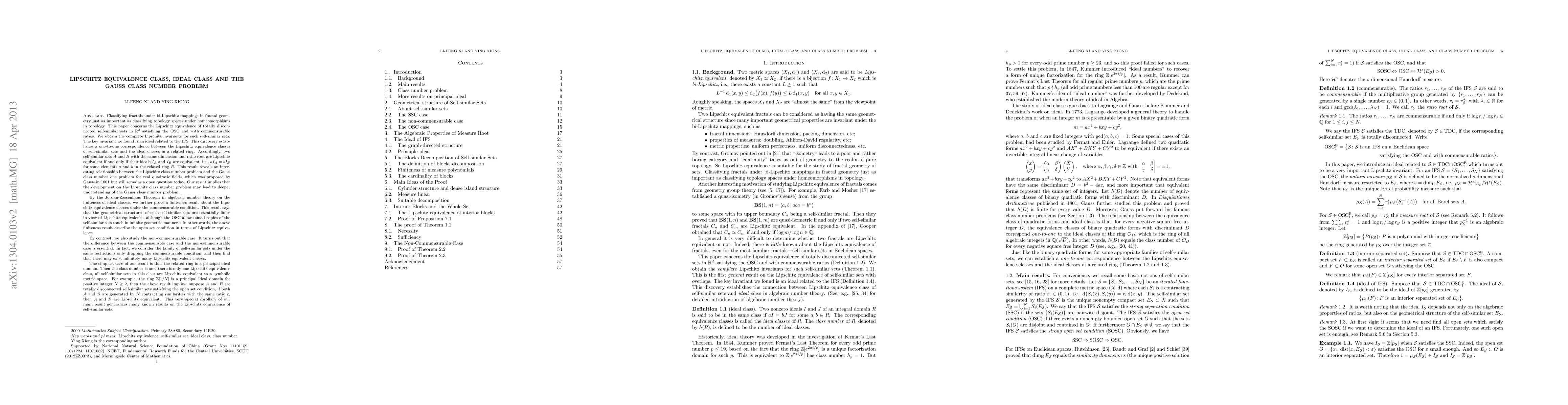 In this paper, we study the question of classifying self-similar sets under bi-Lipschitz mappings and obtain an important bi-Lipschitz invariant, which is an ideal of a ring related to IFS. Roughly speaking, different Lipschitz equivalence classes of self-similar sets correspond to different ideal classes of a related ring. This result reveals an interesting relationship between the Lipschitz classification problem in fractal geometry and the Gauss class number problem in algebraic number theory.