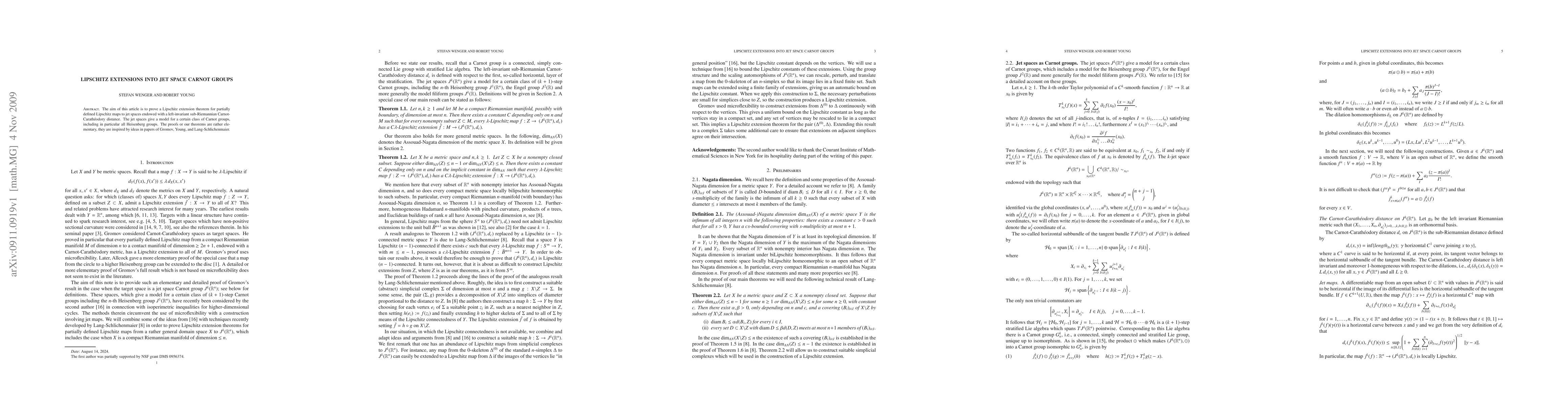 This paper proves a Lipschitz extension theorem for partially defined Lipschitz maps to jet spaces with a sub-Riemannian Carnot-Carathéodory distance, modeling certain Carnot groups including Heisenberg groups, using elementary proofs inspired by Gromov, Young, and Lang-Schlichenmaier.