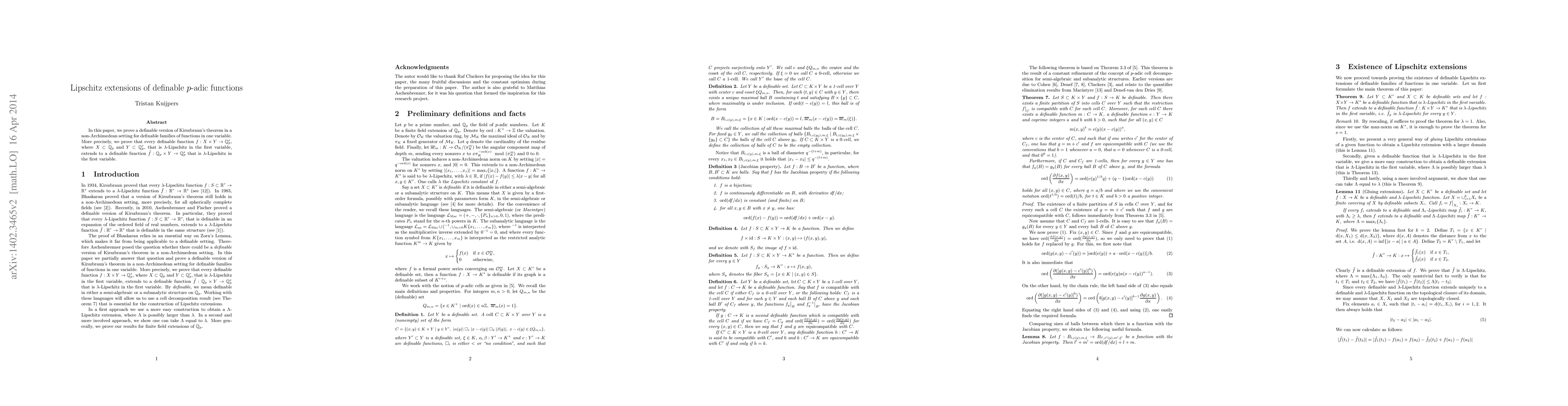 This paper proves a definable version of Kirszbraun's theorem in the p-adic setting, showing that any $\lambda$-Lipschitz definable function in one variable can be extended to a $\lambda$-Lipschitz definable function over the entire p-adic space.