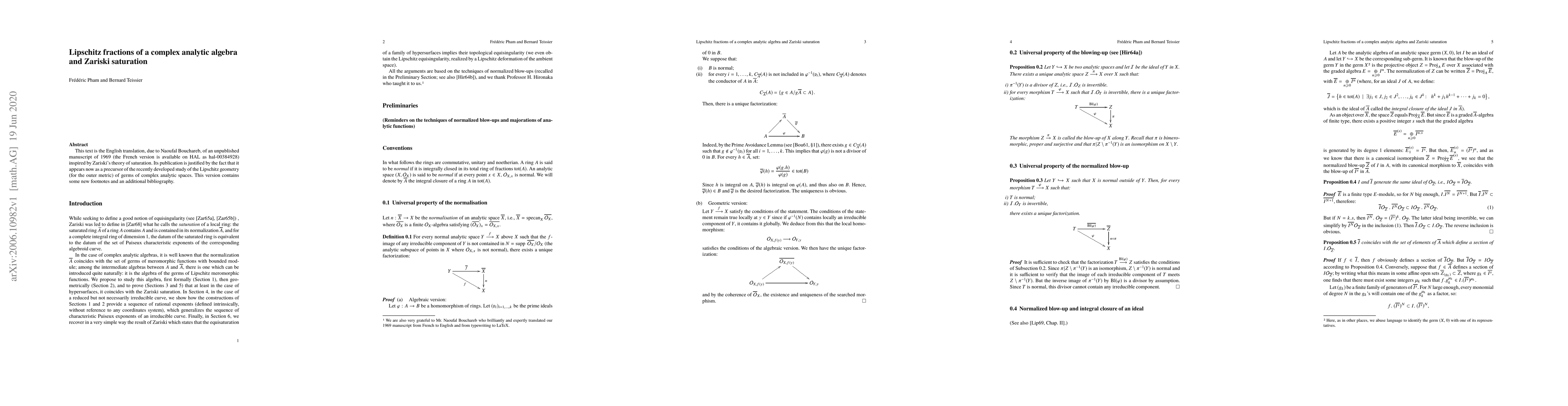This text is the English translation, due to Naoufal Bouchareb, of an unpublished manuscript of 1969 (the French version is available on HAL as hal-00384928) inspired by Zariski's theory of saturation. Its publication is justified by the fact that it appears now as a precursor of the recently developed study of the Lipschitz geometry (for the outer metric) of germs of complex analytic spaces. This version contains some new footnotes and an additional bibliography.