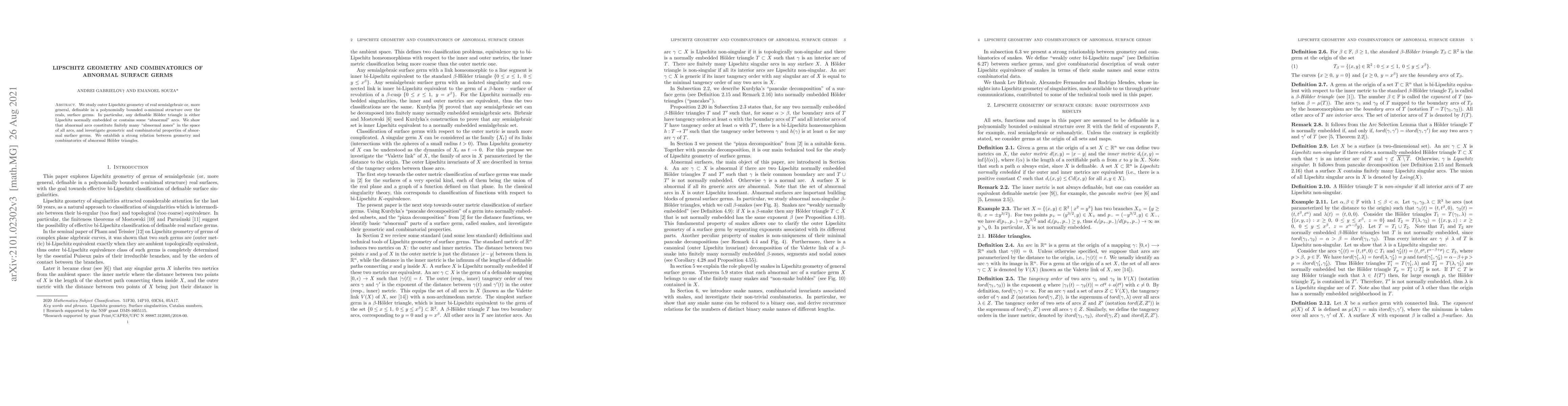 We study outer Lipschitz geometry of real semialgebraic or, more general, definable in a polynomially bounded o-minimal structure over the reals, surface germs. In particular, any definable H\"older triangle is either Lipschitz normally embedded or contains some "abnormal" arcs. We show that abnormal arcs constitute finitely many "abnormal zones" in the space of all arcs, and investigate geometric and combinatorial properties of abnormal surface germs. We establish a strong relation between geometry and combinatorics of abnormal H\"older triangles.