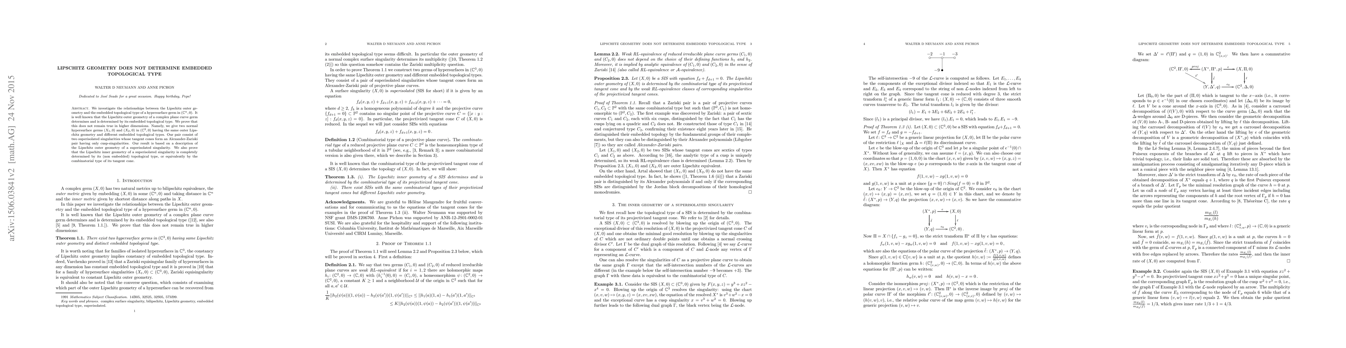 We investigate the relationships between the Lipschitz outer geometry and the embedded topological type of a hypersurface germ in $(\mathbb C^n,0)$. It is well known that the Lipschitz outer geometry of a complex plane curve germ determines and is determined by its embedded topological type. We prove that this does not remain true in higher dimensions. Namely, we give two normal hypersurface germs $(X_1,0)$ and $(X_2,0)$ in $(\mathbb C^3,0)$ having the same outer Lipschitz geometry and different embedded topological types. Our pair consist of two superisolated singularities whose tangent cones form an Alexander-Zariski pair having only cusp-singularities. Our result is based on a description of the Lipschitz outer geometry of a superisolated singularity. We also prove that the Lipschitz inner geometry of a superisolated singularity is completely determined by its (non embedded) topological type, or equivalently by the combinatorial type of its tangent cone.