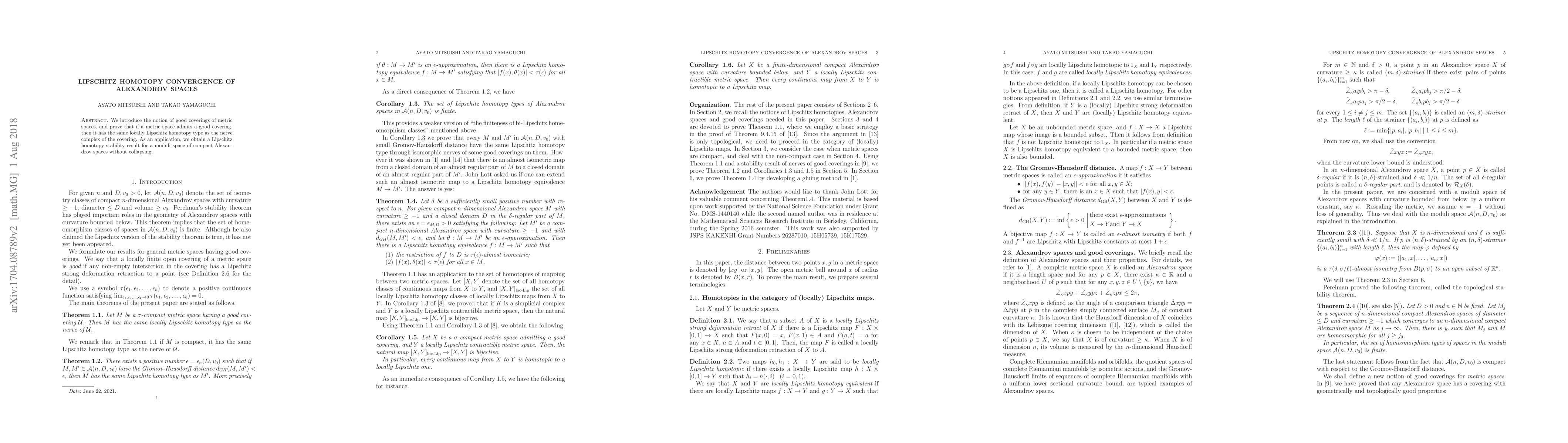 This paper introduces the concept of good coverings for metric spaces and proves that such spaces share the same locally Lipschitz homotopy type as the nerve complex of the covering. It also demonstrates Lipschitz homotopy stability for a moduli space of compact Alexandrov spaces without collapse.