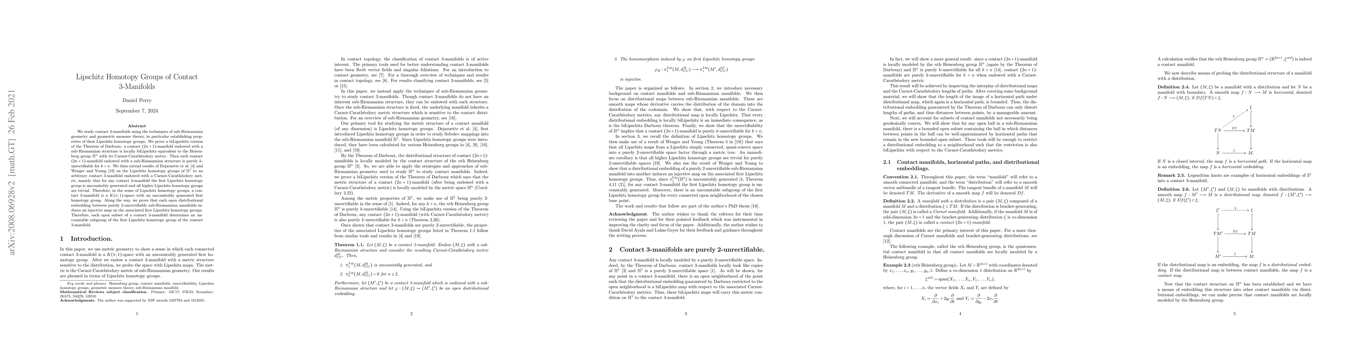 We study contact 3-manifolds using the techniques of sub-Riemannian geometry and geometric measure theory, in particular establishing properties of their Lipschitz homotopy groups. We prove a biLipschitz version of the Theorem of Darboux: a contact $(2n+1)$-manifold endowed with a sub-Riemannian structure is locally biLipschitz equivalent to the Heisenberg group $\mathbb{H}^n$ with its \cc metric. Then each contact $(2n+1)$-manifold endowed with a sub-Riemannian structure is purely $k$-unrectifiable for $k>n$. We then extend results of Dejarnette et al. (arXiv:1109.4641 [math.FA]) and Wenger and Young (arXiv:1210.6943 [math.GT]) on the Lipschitz homotopy groups of $\mathbb{H}^1$ to an arbitrary contact 3-manifold endowed with a \cc metric, namely that for any contact 3-manifold the first Lipschitz homotopy group is uncountably generated and all higher Lipschitz homotopy groups are trivial. Therefore, in the sense of Lipschitz homotopy groups, a contact 3-manifold is a $K(\pi,1)$-space with an uncountably generated first homotopy group. Along the way, we prove that each open distributional embedding between purely 2-unrectifiable sub-Riemannian manifolds induces an injective map on the associated first Lipschitz homotopy groups. Therefore, each open subset of a contact 3-manifold determines an uncountable subgroup of the first Lipschitz homotopy group of the contact 3-manifold.