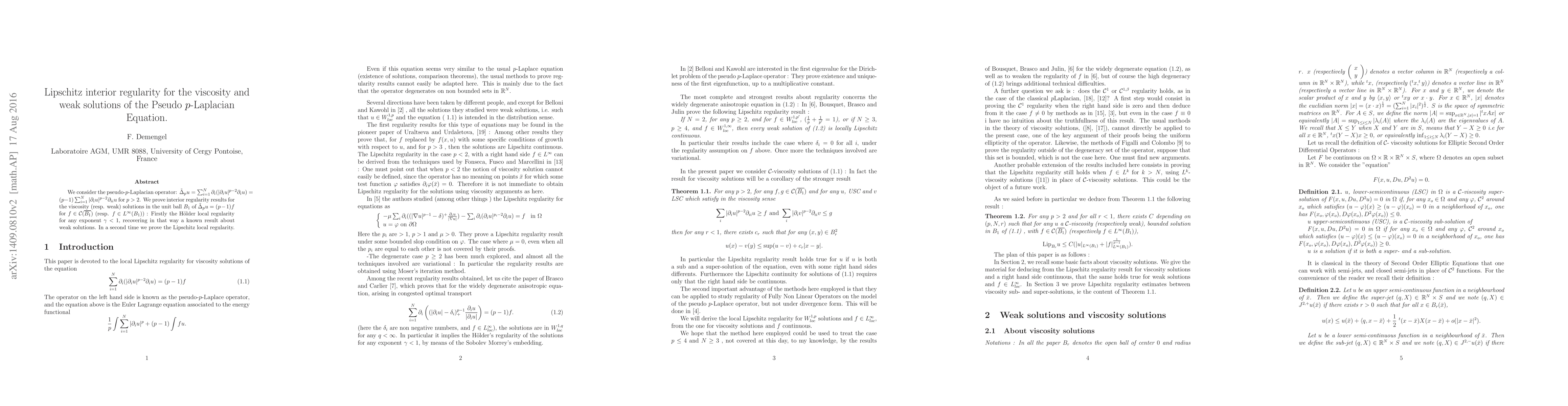 We prove interior Lipschitz regularity result for weak and viscosity solutions of the pseudo $p$Laplacien $(p-1)\sum_i |\partial_i u|^{p-2} \partial_{ii} u = f$ for $p>2$ and $f$ bounded.