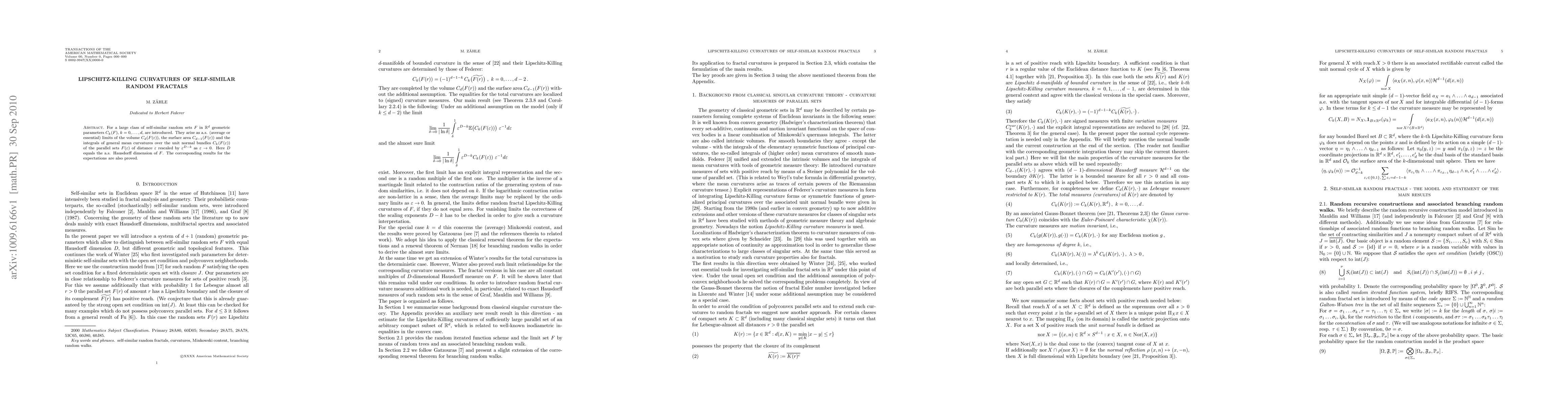 This paper introduces geometric parameters C_k(F) for self-similar random fractals in R^d, which represent limits of volume, surface area, and mean curvature integrals as the scaling parameter approaches zero. The results establish the almost sure convergence of these parameters to the Hausdorff dimension D of the fractal.