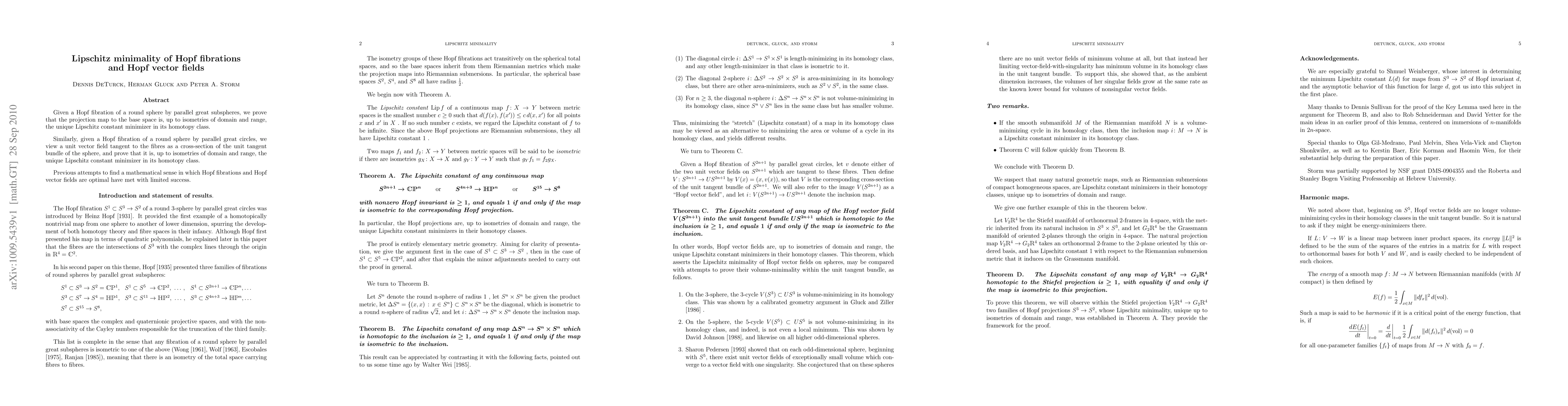 The research proves that Hopf fibrations projecting parallel great subspheres and parallel great circles on a round sphere are the unique Lipschitz constant minimizers in their respective homotopy classes, offering a novel perspective on the optimality of these structures. This resolves previous challenges in establishing a mathematical framework for the optimality of Hopf fibrations and vector fields.