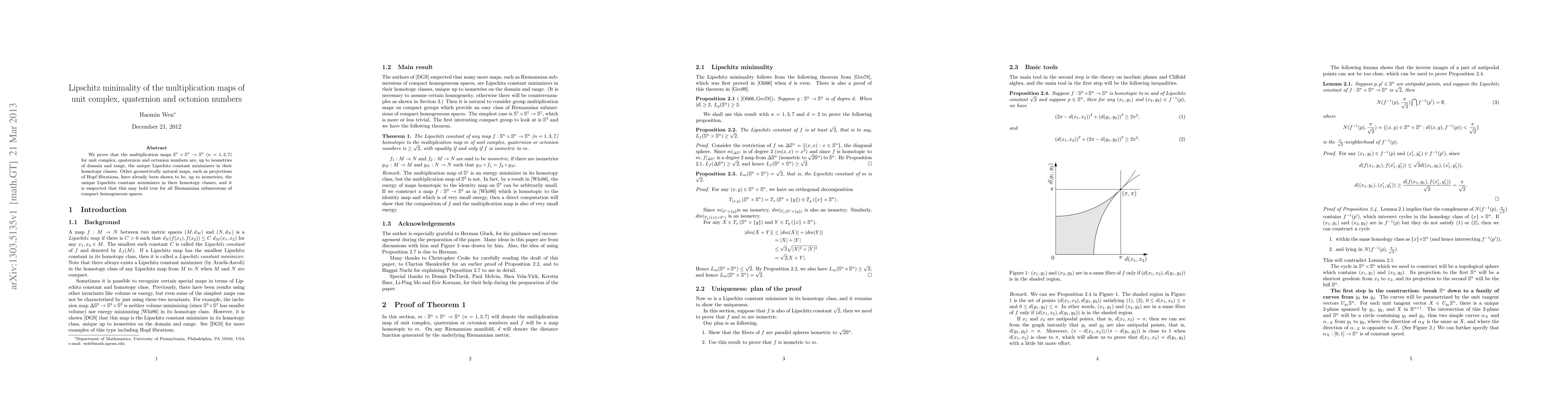 This paper proves that the multiplication maps for unit complex, quaternion, and octonion numbers are the unique Lipschitz constant minimizers in their homotopy classes, up to isometries. It extends the notion that geometrically natural maps, like projections of Hopf fibrations, hold this property.