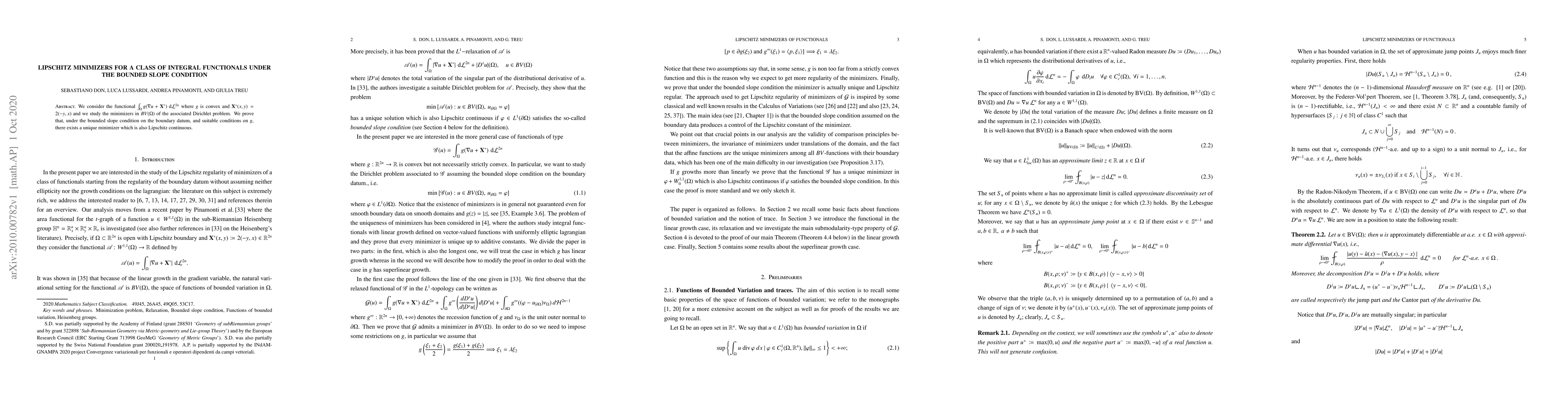 This paper investigates the existence and uniqueness of Lipschitz minimizers for a specific integral functional under the bounded slope condition. It proves that, given suitable conditions on the convex function $g$, there is a unique Lipschitz continuous minimizer for the associated Dirichlet problem in $BV(\Omega)$.