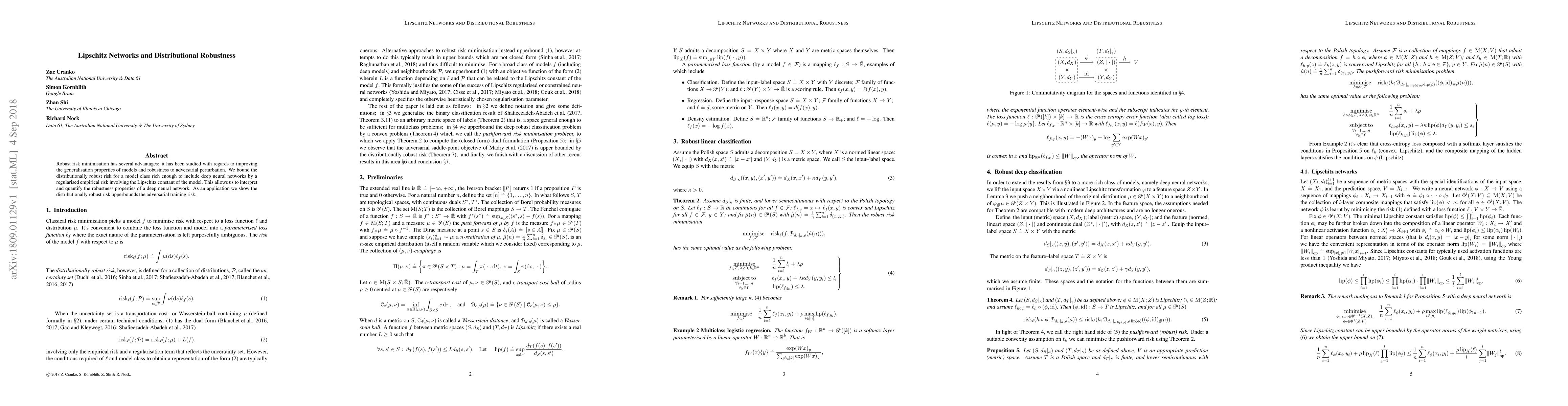 Robust risk minimisation has several advantages: it has been studied with regards to improving the generalisation properties of models and robustness to adversarial perturbation. We bound the distributionally robust risk for a model class rich enough to include deep neural networks by a regularised empirical risk involving the Lipschitz constant of the model. This allows us to interpretand quantify the robustness properties of a deep neural network. As an application we show the distributionally robust risk upperbounds the adversarial training risk.