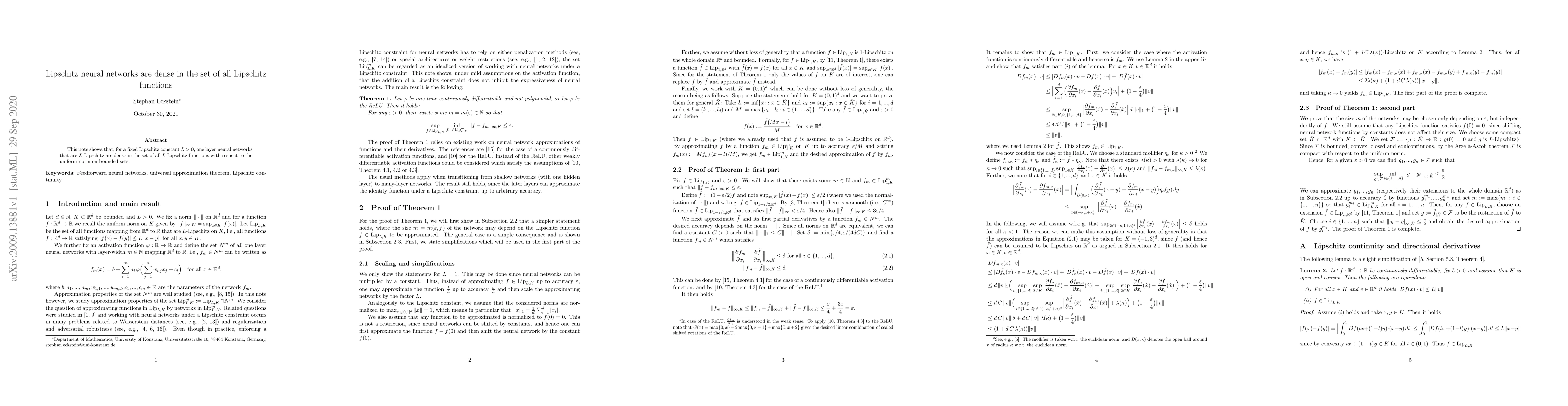 Summary: This paper demonstrates that one-layer neural networks with an $L$-Lipschitz constraint are dense in the set of all $L$-Lipschitz functions when evaluated under the uniform norm on bounded domains. This implies the approximation capability of neural networks in representing Lipschitz functions.