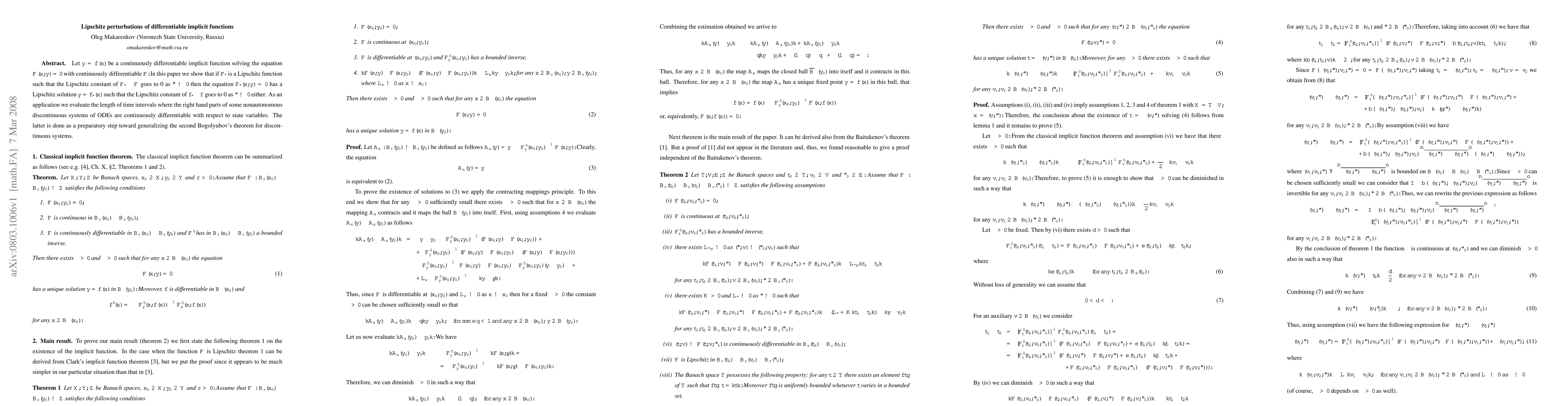 Let $y=f(x)$ be a continuously differentiable implicit function solving the equation $F(x,y)=0$ with continuously differentiable $F.$ In this paper we show that if $F_\eps$ is a Lipschitz function such that the Lipschitz constant of $F_\eps-F$ goes to 0 as $\eps\to 0$ then the equation $F_\eps(x,y)=0$ has a Lipschitz solution $y=f_\eps(x)$ such that the Lipschitz constant of $f_\eps-f$ goes to 0 as $\eps\to 0$ either. As an application we evaluate the length of time intervals where the right hand parts of some nonautonomous discontinuous systems of ODEs are continuously differentiable with respect to state variables. The latter is done as a preparatory step toward generalizing the second Bogolyubov's theorem for discontinuous systems.
