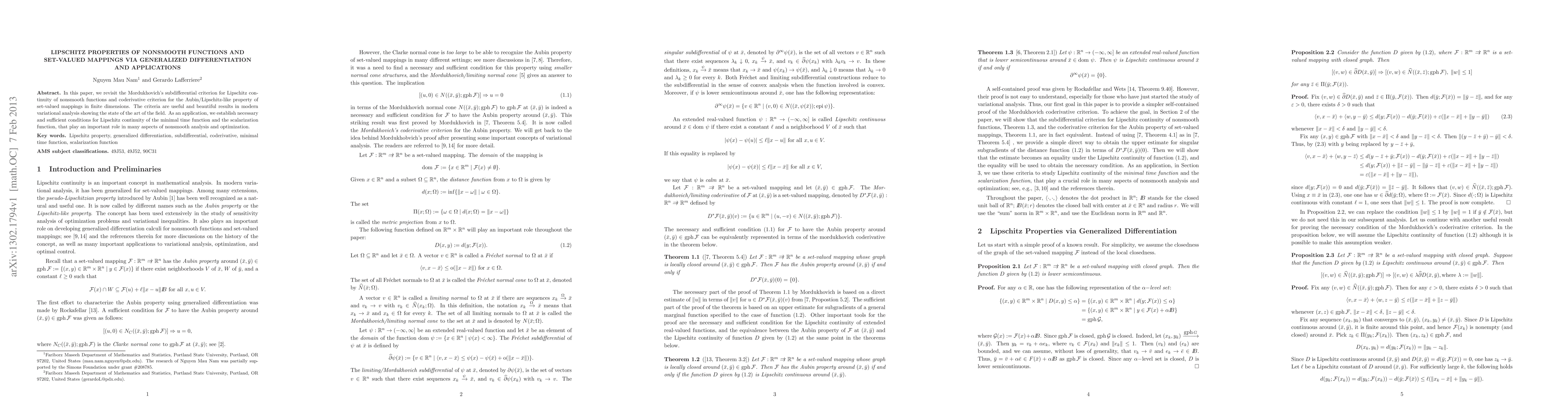 This paper explores Mordukhovich's subdifferential and coderivative criteria for Lipschitz continuity of nonsmooth functions and set-valued mappings, respectively. It applies these criteria to establish necessary and sufficient conditions for the Lipschitz continuity of the minimal time function and the scalarization function in optimization.