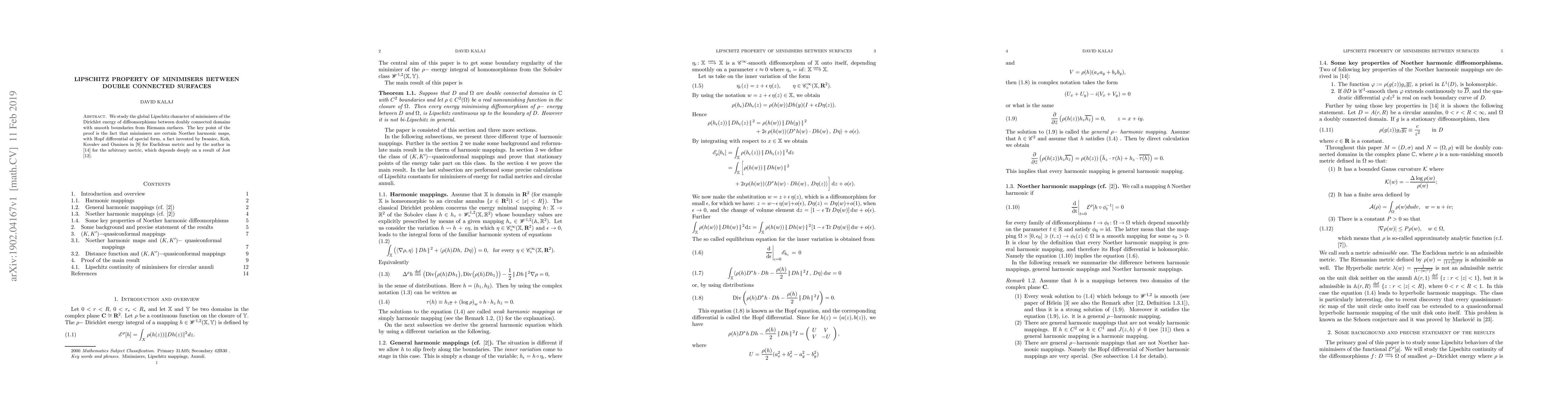 We study the global Lipschitz character of minimisers of the Dirichlet energy of diffeomorphisms between doubly connected domains with smooth boundaries from Riemann surfaces. The key point of the proof is the fact that minimisers are certain Noether harmonic maps, with Hopf differential of special form, a fact invented by Iwaniec, Koh, Kovalev and Onninen in \cite{inv} for Euclidean metric and by the author in \cite{calculus} for the arbitrary metric, which depends deeply on a result of Jost \cite{Job1}.