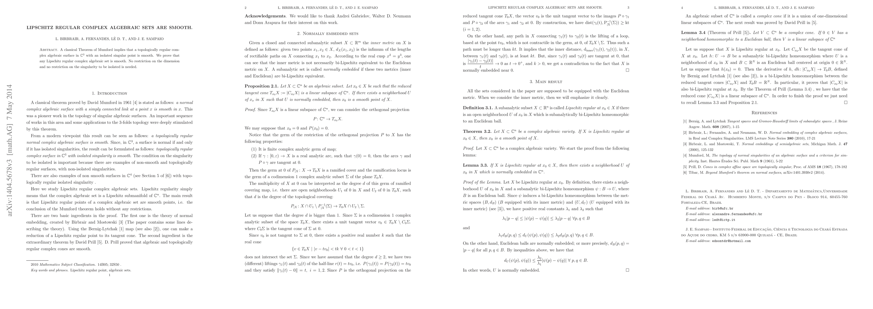 The classical Theorem of Mumford states that a topologically regular complex algebraic surface in $\mathbb{C}^3$ with an isolated singular point is smooth. We proof that any Lipschitz regular complex algebraic set is smooth. No restriction on the dimension is needed. No restriction of singularity to be isolated is needed.