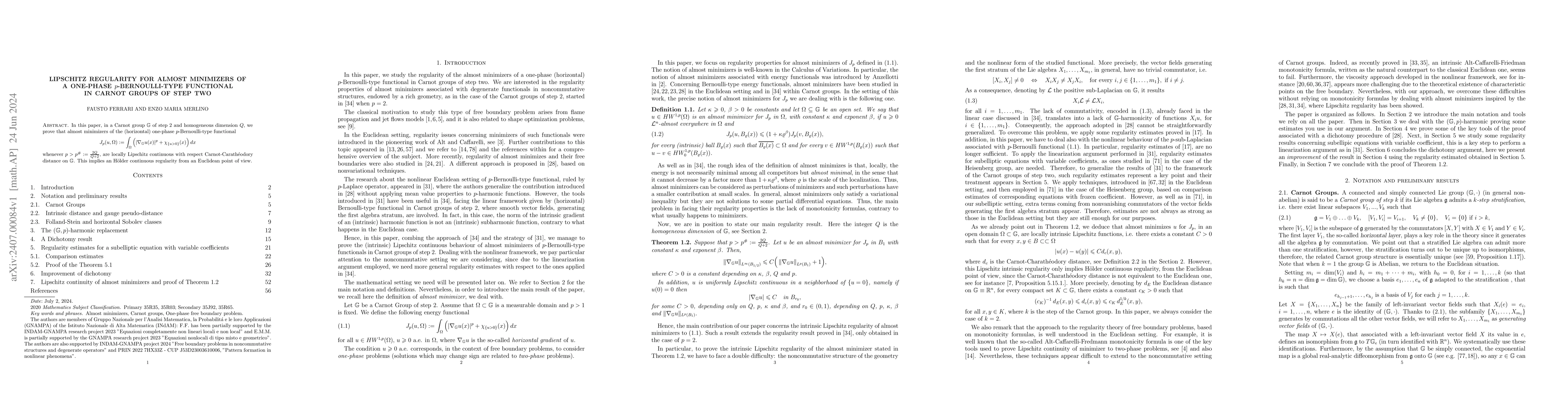 This paper demonstrates that almost minimizers of a one-phase $p$-Bernoulli-type functional in a Carnot group of step two are locally Lipschitz continuous with respect to the Carnot-Carathéodory distance, provided $p > p^\#:=\frac{2Q}{Q+2}$. This regularity implies H\"older continuity from an Euclidean perspective.