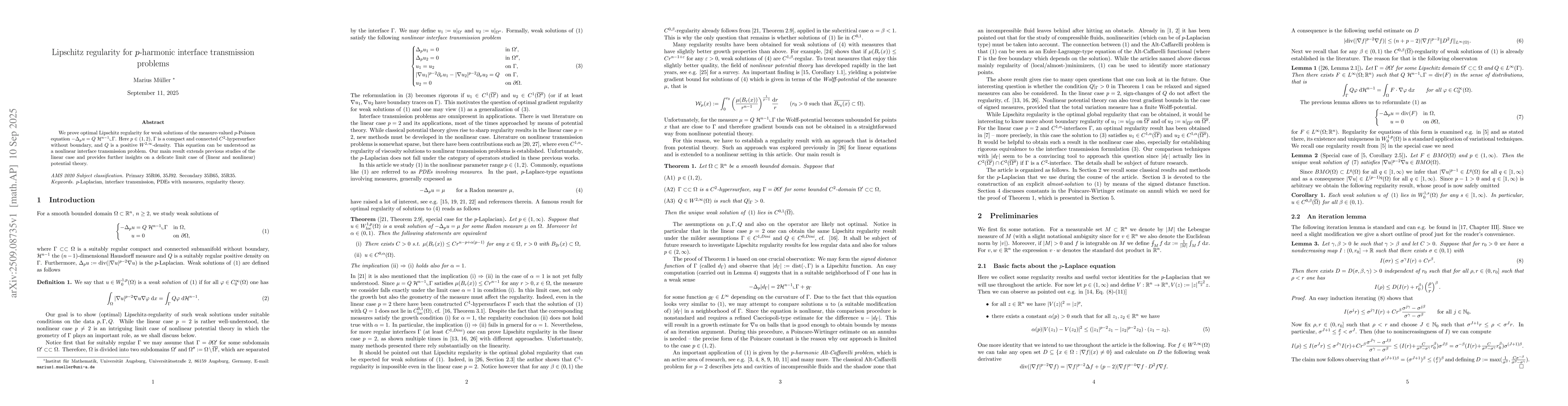 We prove optimal Lipschitz regularity for weak solutions of the measure-valued $p$-Poisson equation $-\Delta_p u = Q \; \mathcal{H}^{n-1} \llcorner \Gamma$. Here $p \in (1,2)$, $\Gamma$ is a compact and connected $C^2$-hypersurface without boundary, and $Q$ is a positive $W^{2,\infty}$-density. This equation can be understood as a nonlinear interface transmission problem. Our main result extends previous studies of the linear case and provides further insights on a delicate limit case of (linear and nonlinear) potential theory.