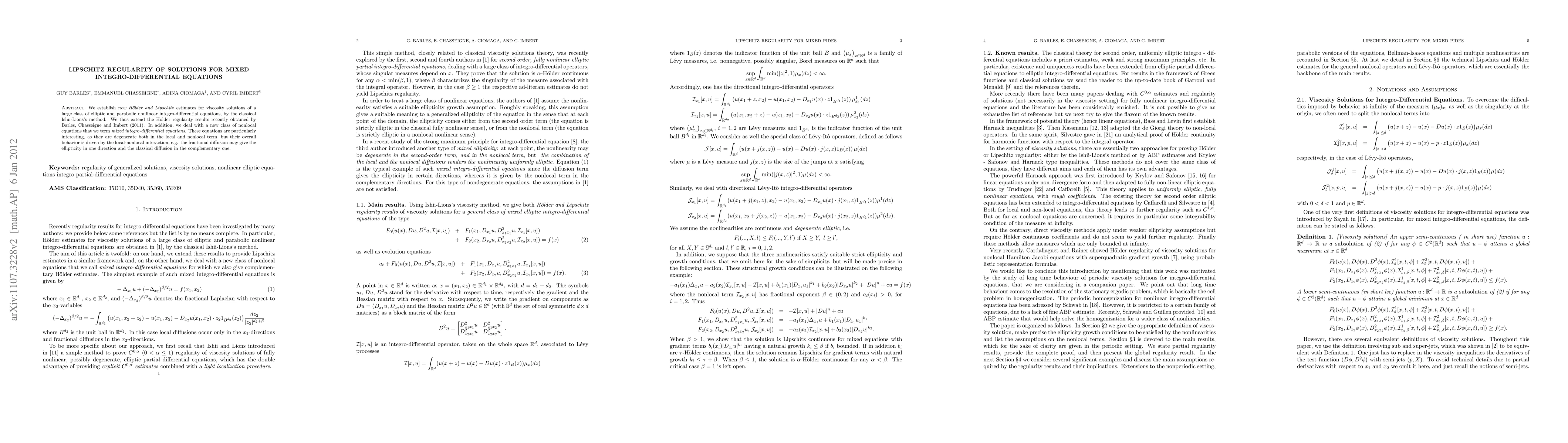 The paper establishes new Hoelder and Lipschitz estimates for viscosity solutions of mixed integro-differential equations using the classical Ishii-Lions's method, extending previous results by Barles, Chasseigne, and Imbert (2011).