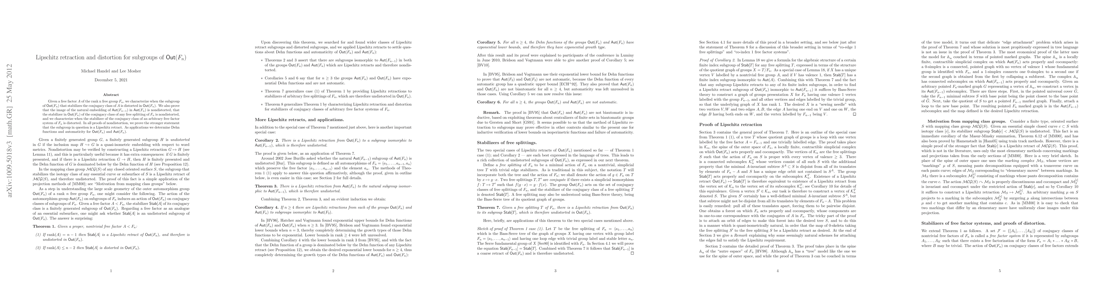 This paper characterizes when subgroups of Out(F_n) that stabilize free factors or free splittings are distorted, proving nondistortion and Lipschitz retraction for certain subgroups. It also determines the Dehn functions and automaticity for Out(F_n) and Aut(F_n).