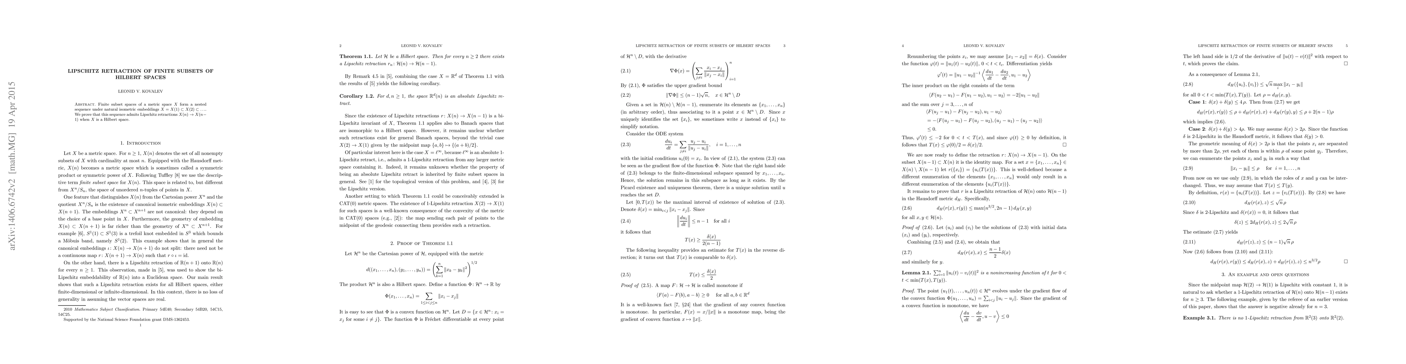 Summary: The paper proves the existence of Lipschitz retractions for finite subset sequences in Hilbert spaces, demonstrating that each finite subset space can be retracted to its predecessor in the sequence. This result extends the Lipschitz retraction property to nested finite subsets of Hilbert spaces.