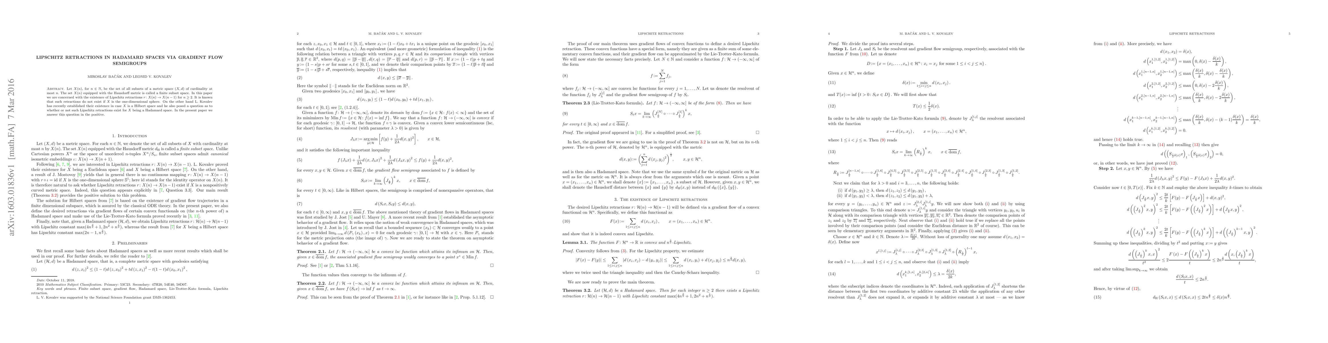 This paper investigates the existence of Lipschitz retractions from finite subset spaces $X(n)$ to $X(n-1)$ in Hadamard spaces, confirming their existence via gradient flow semigroups. The study resolves a question posed by Kovalev regarding whether such retractions exist when the metric space is a Hadamard space.